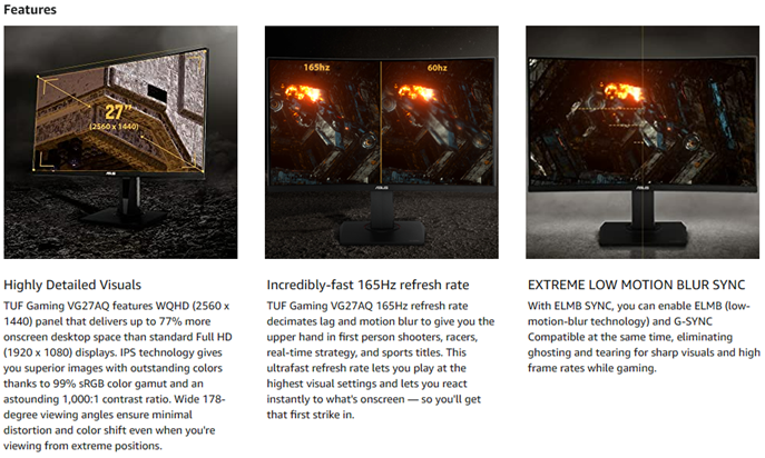 Designed for intense fast-paced games. The Asus TUF Gaming VG27AQ is a 27” WQHD gaming IPS display with 1ms (MPRT) response time and blazing 165Hz refresh rate to give you super-smooth game play. The VG27AQ features G-SYNC compatibility and ELMB Sync technology to eliminate screen tearing and ghosting.