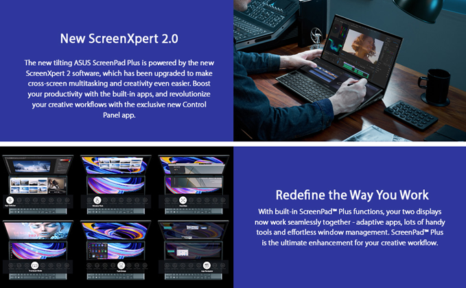 • Enhanced productivity: the tilting ScreenPad Plus – a secondary 14 inch 4K touchscreen that automatically tilts up for comfortable viewing - gives you endless ways to optimize your multitasking experience