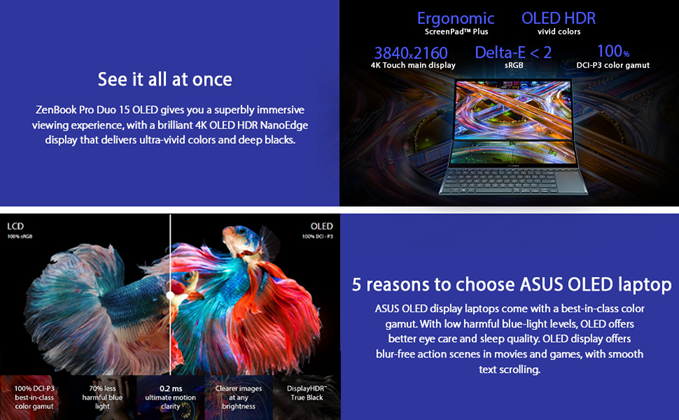 • Amazing visuals: this 15” touchscreen laptop has a 4K OLED HDR NanoEdge display. ASUS OLED laptop computers provide ultrasmooth visuals, professional-grade colors and better eye care.