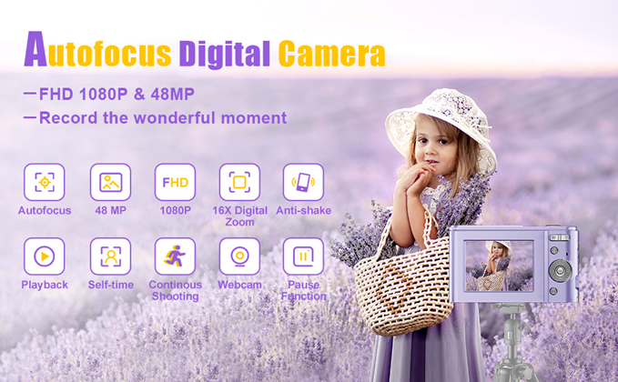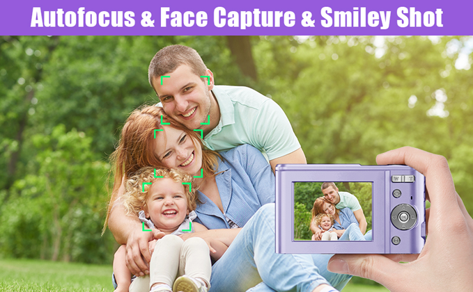 - 【Upgraded Autofocus Digital Camera】 New released autofocus digital camera for teens, when you press the shooting button halfway, it will catch the focus automatically, and after the focus frame on the screen turn green you need press shooting button fully to get vivid macro images, concentrate more on capturing the momentary scene of the subject, this small digital camera is easy to operate to meet the needs of kids teenagers students elderly.
