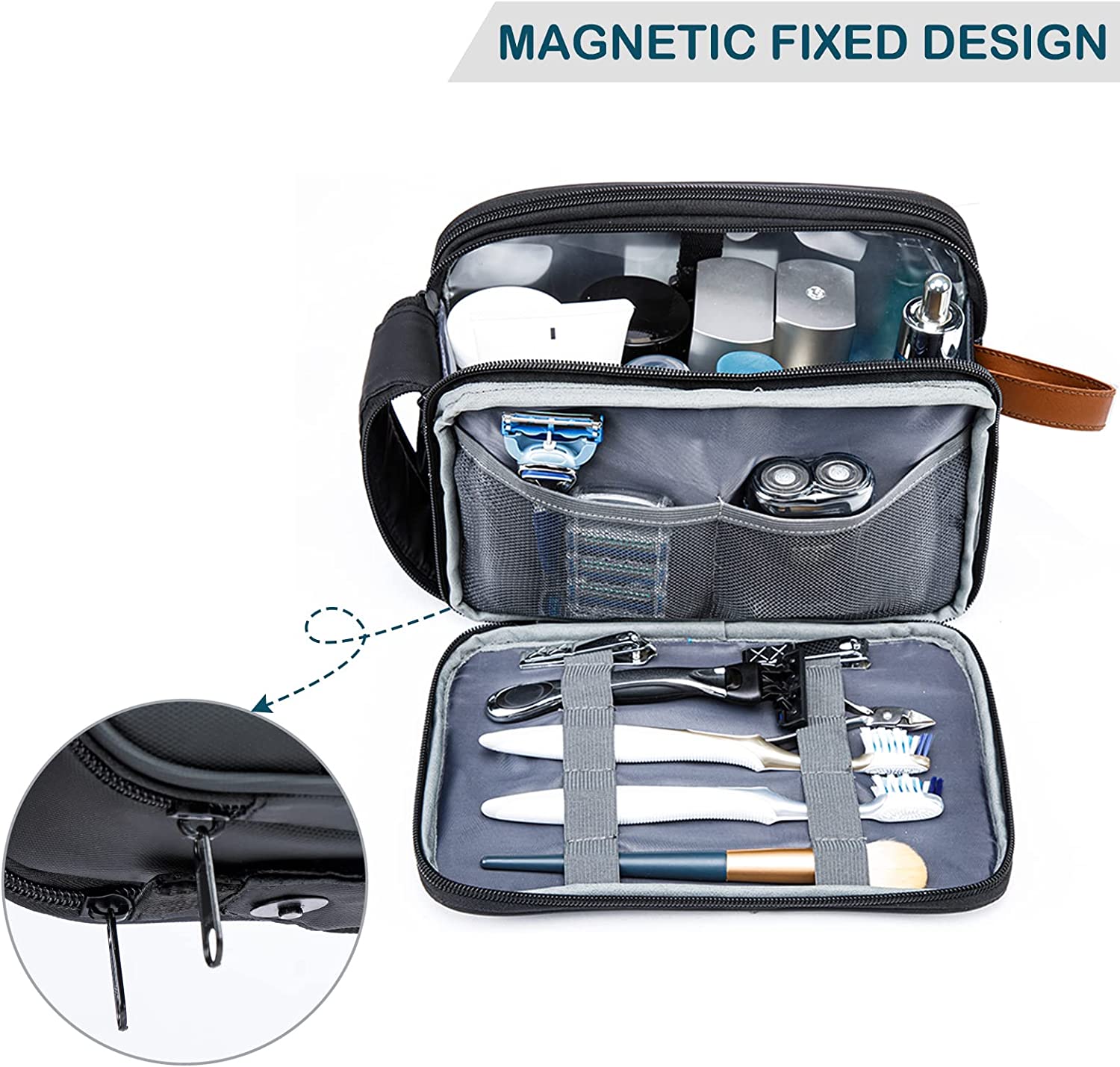 DOUBLE SIDE FULL OPEN DESIGN - Our travel bag 2 side compartments can be laid flat, no need to open the main compartment to search. Use the elastic band, mesh pockets and pouches to sort your tooth brushes, razors, electric trimmer, toothpaste, hair brush, or shaving razors easily accessible.