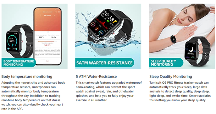 - 【Multi-Function Smart Watch】: The Q9 PRO smartwatch fitness tracker can provide all-around body data tracking, allowing you to accurately track 24-hour bady data and stress levels. Automatically monitor your sleep (Deep sleep, Light sleep, Awake time)to tell you how long you sleep during the night. sleep, Light sleep, Awake time)to tell you how long you sleep during the night.