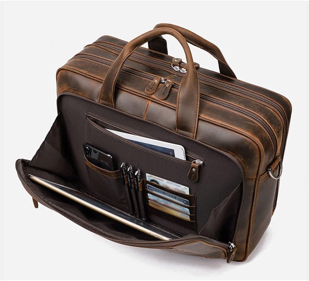 Men's Leather Briefcase Crazy Horse Leather 17" Laptop Business Tote Men's Tote Large Shoulder Bag.
