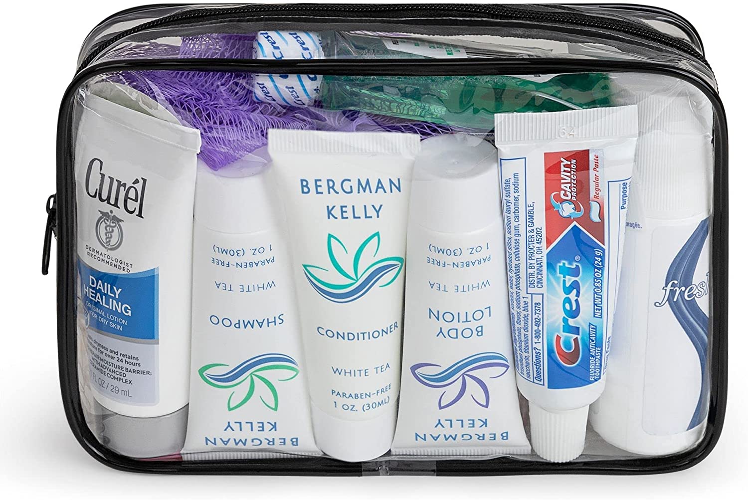 TOILETRY TRAVEL ESSENTIALS INSIDE - Professional Disposable Manicure Kit, Sewing kit pack, Toothpaste, Tooth brush, Mouth wash, Shampoo, Lotion, Soap, Deodorant, Shower sponge, Hand wipe, Hand cream, Tylnol, Advl, Cotton Pads, Cotton Swabs, Nail File, Nail clipper, Tweezers, Comb, Body wipes, Makeup remover, Elastic hair tie, Shout, Shavers, Shaving cream, Mint, Gum, Dental floss, Bandages