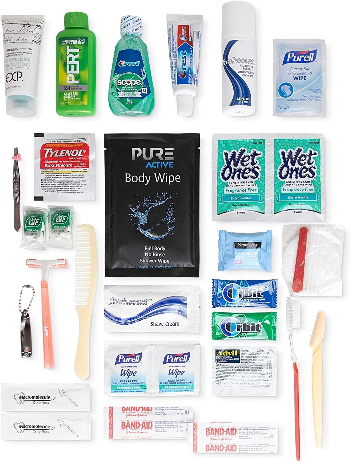TOILETRY ESSENTIALS KITS - Toothpaste, Tooth brush, Mouth wash, Shampoo, Deodorant, Hand wipe, Hand cream, Tylnol, Advl, Cotton Pads, Cotton Swabs, Nail File, Nail clipper, Tweezers, Comb, Body wipes, Makeup remover, Shavers, Shaving cream, Mint, Gum, Dental floss, Bandages