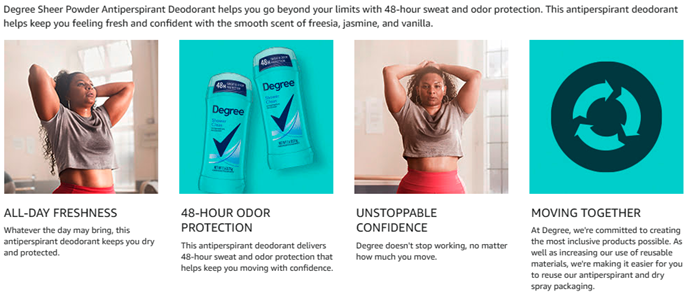 Degree is upgrading to our best formula yet. Our new and improved formulation gives you 72 hours of nonstop sweat and odor protection. You will still find all the same fragrances you know and love, but now with our new and improved long lasting protection! For a limited time, you may still receive our old 48-hour formulation while all our new 72-hour products make their way to a store near you. For the details of these changes, scroll down to see a full list of ingredients. Degree Advanced Shower Clean Antiperspirant Deodorant delivers nonstop protection, so you can face the day with confidence. This antiperspirant for women features 72-hour sweat and odor protection and the bright floral scent of rose and jasmine, blended with delicate fruit for an invigorating, clean feeling. Only Degree has MotionSense technology that moves in sync with your body. This antiperspirant deodorant spray releases a burst of subtle fragrance every time you move, for nonstop protection. Degree Advanced Shower Clean Antiperspirant Deodorant keeps you feeling fresher, drier, and more confident. This powerful antiperspirant deodorant responds when you need it most so that you don't have to worry about slowing down. Simply swipe and start moving.