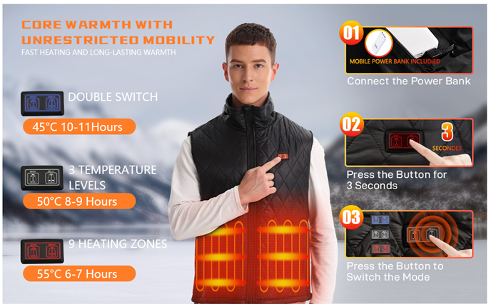- 9 Heating Zones-The heated vests for men have 9 heating zones, which are Abdomen*2, Mid Back*2, Collar*1, Shoulder*2, Waist*2, the front and back heating zones are independently controlled by two switches. The heating zones are just right to warm up your core and hands in the pockets and the back zone is big enough to cover most of your back, enough warmer. The effective heat therapy to promote blood circulation, great for pain relief, relieve the discomfort of rheumatism & muscles.