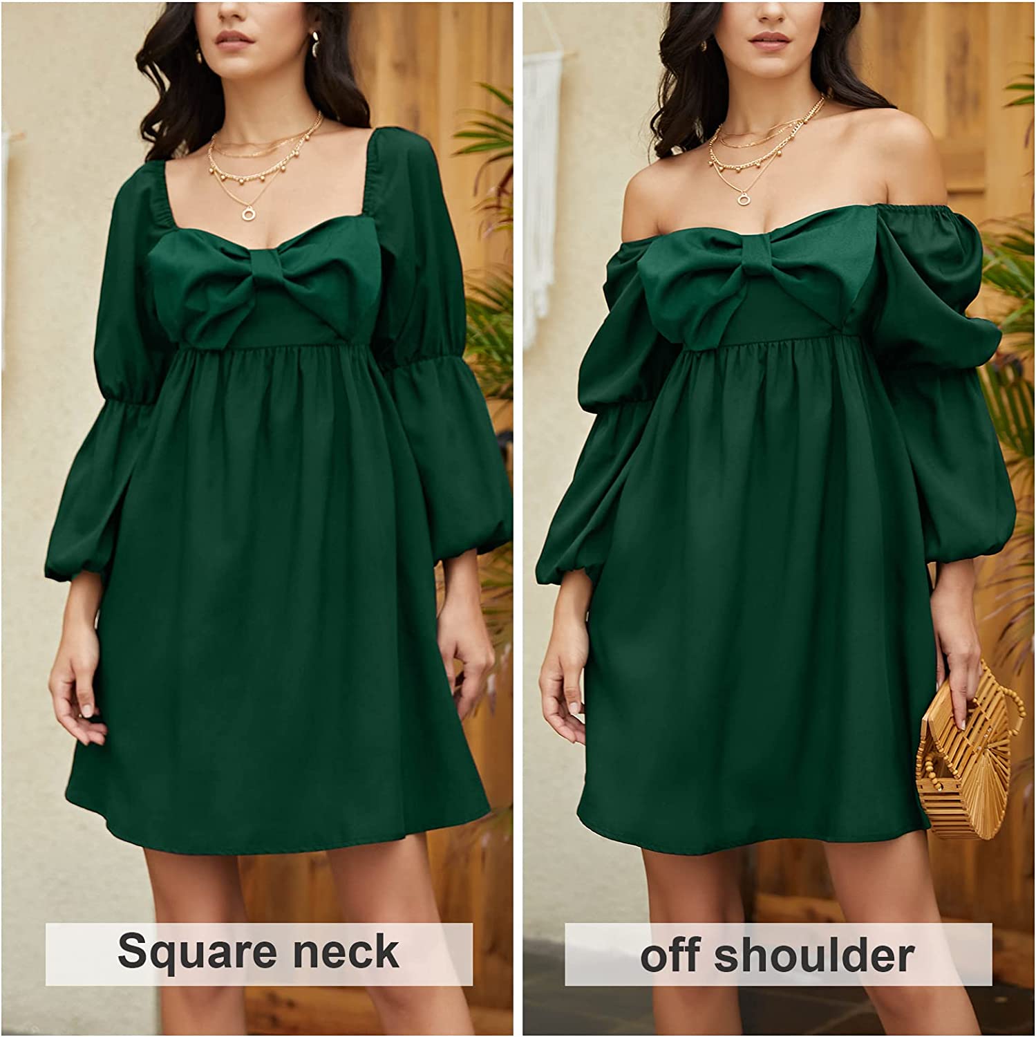 EXLURA Womens Summer Casual Wedding Guest Dress Square Bow Neck Long Puff Sleeve Dress Empire Waist Babydoll Mini Dress