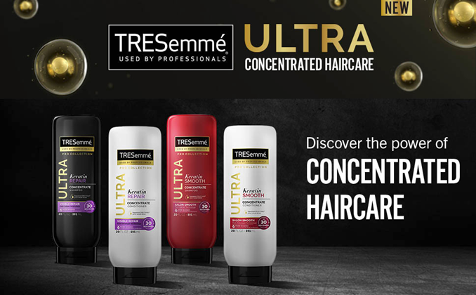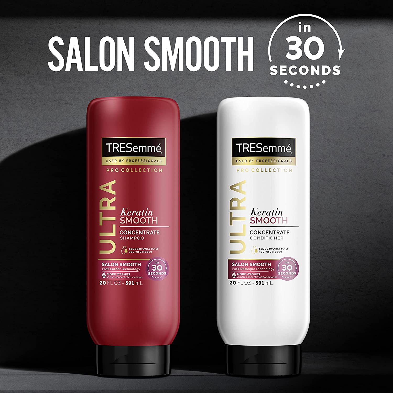 TRESemmé Ultra Keratin Smooth Concentrate System delivers salon-level smoothness and shine in 30 seconds and transforms frizzy hair. This shampoo and conditioner system delivers 2X more washes* and contains 2X the keratin smoothing actives per concentrated drop.