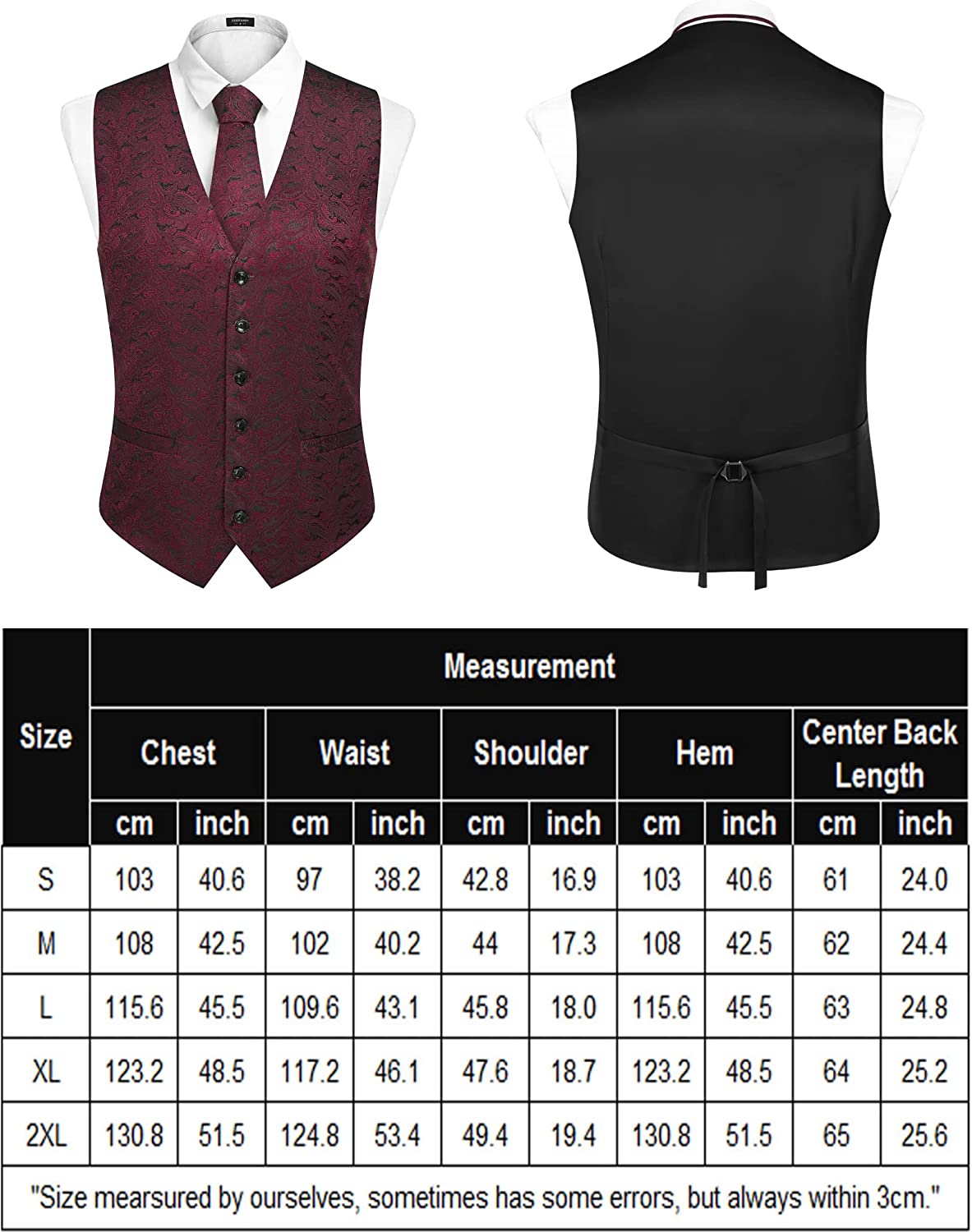 - 【Excellent Design】:The men floral vest and tie set features with 2 real pockets, 6 buttons front, v-neck, adjustable back belt. Paisley Waistcoat fits well on yourselves and it will makes you look sharp. Make you more attractive as wearing it.