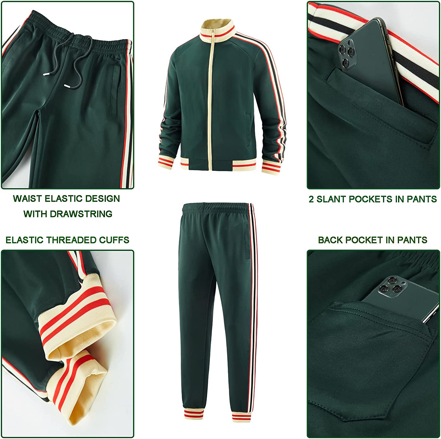 Tracksuit men has a relaxed fit preventing any bunching or tightness; full-zip front offers easy on-and-off, pockets on both track jackets and pants, convenient for you to bring small things with you, like keys, phone