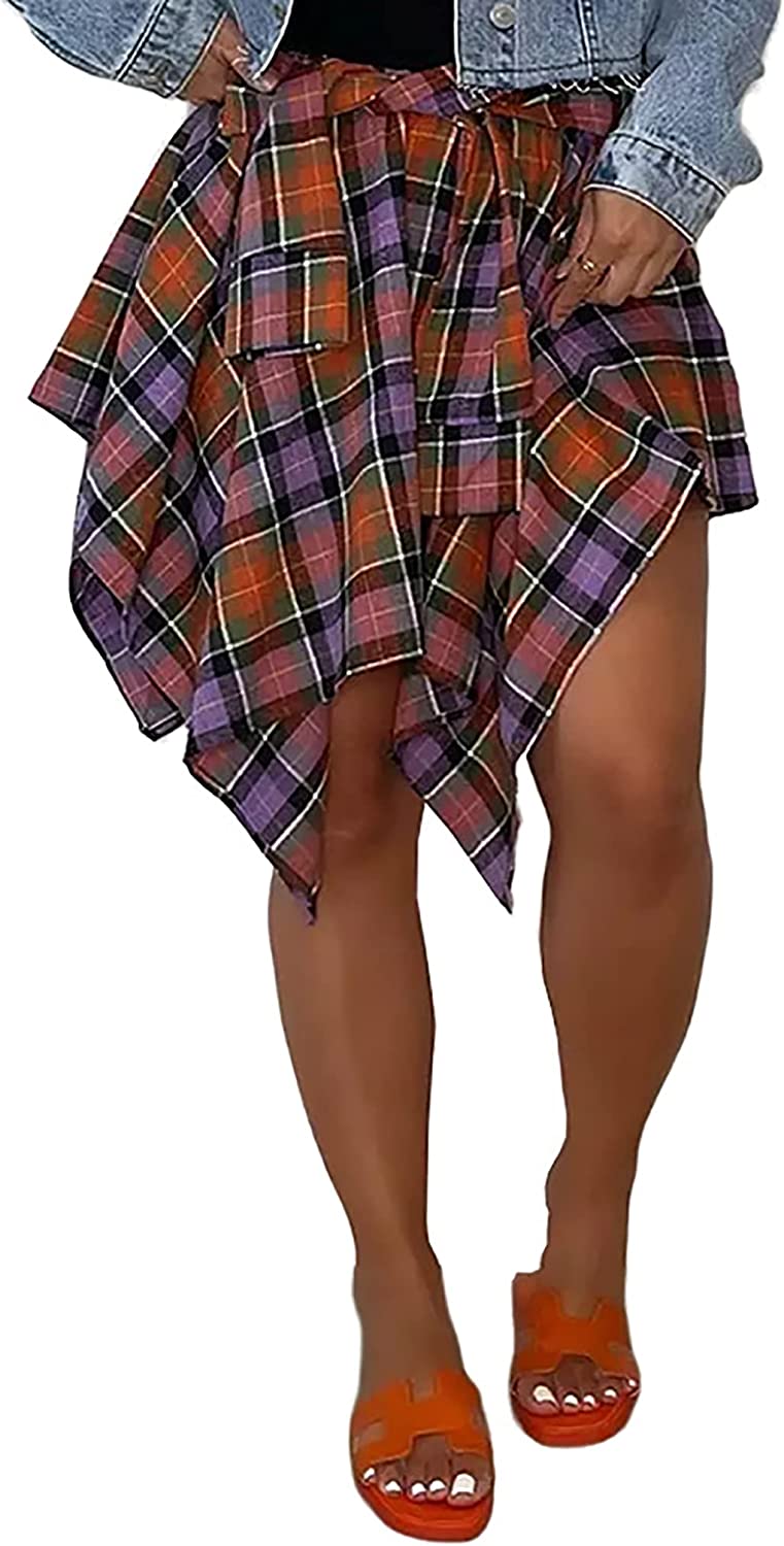 Features: 90s vibes plaid pattern, grunge pleated design, irregular hem, flared A-line shape, and elastic waist, shirt-sleeve-style ties design, just like tying plaid overshirts around our waist.