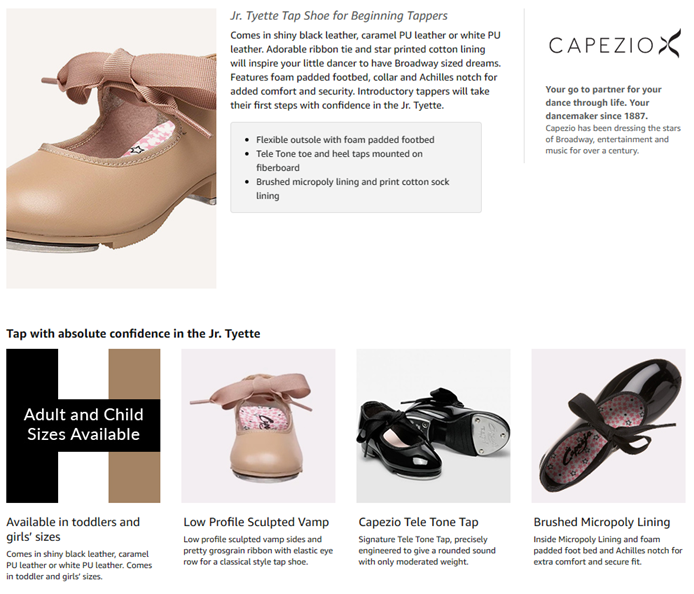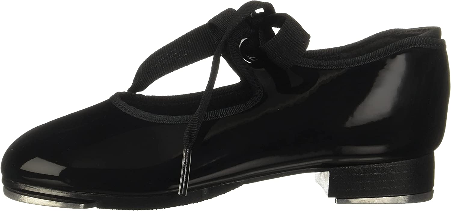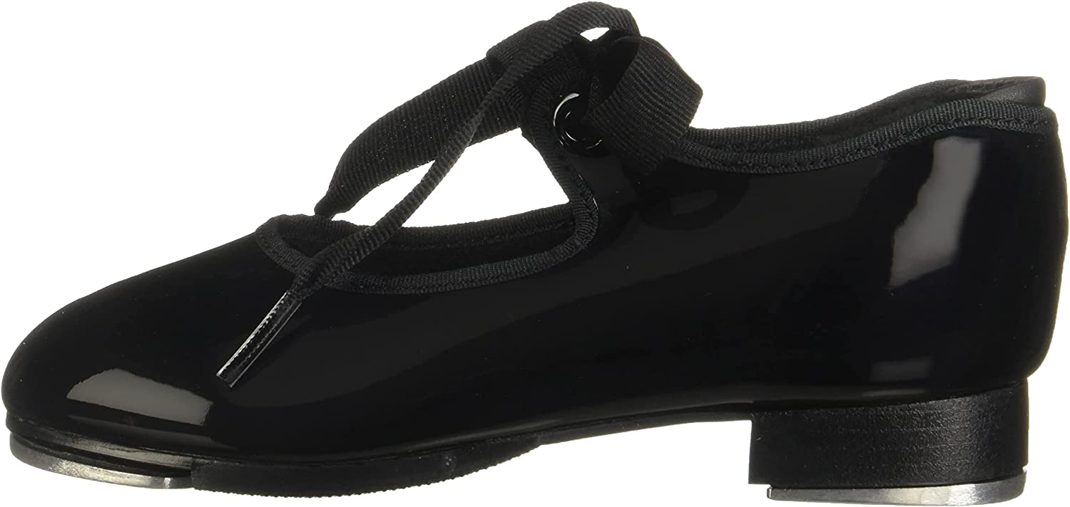 The Jr. Tyette tap shoe is the number one choice for a beginner tapper. Comes in shiny black patent leather, caramel PU leather or white PU leather. Adorable ribbon tie and star printed cotton lining will inspire your little dancer to have Broadway sized dreams. Features foam padded footbed, collar and Achilles notch for added comfort and security. Introductory tappers will take their first steps with confidence in the Jr. Tyette.