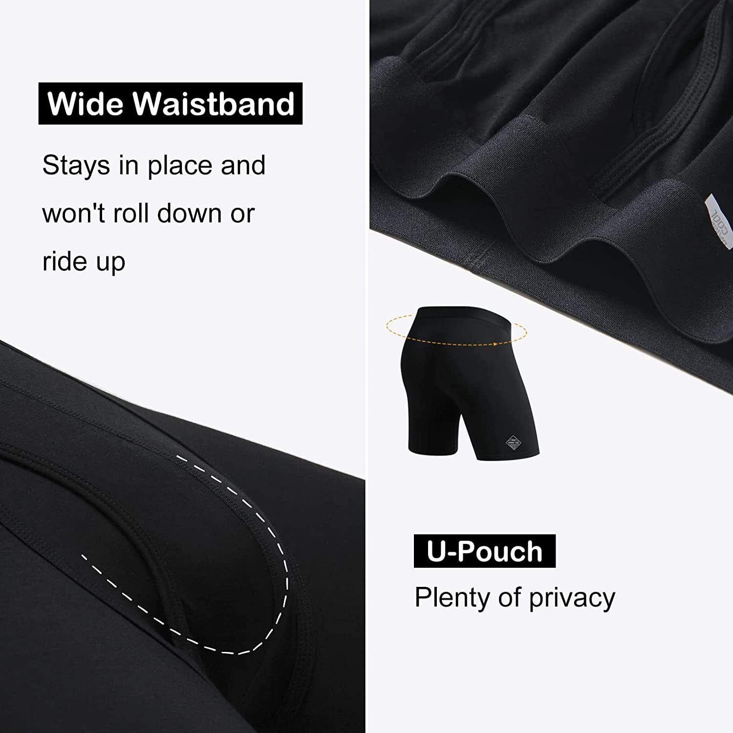 【NO-RIDE-UP】: This fabric is Bamboo Viscose & Spandex, which is a lightweight, breathable, stretchy pair that won't fade or shrink fabric. Bamboo fabric has a natural moisture absorption and perspiration functionThe design of lengthen the leg will more securely wrap the important parts of men, and effectively reduce the friction between the legs.