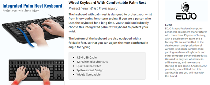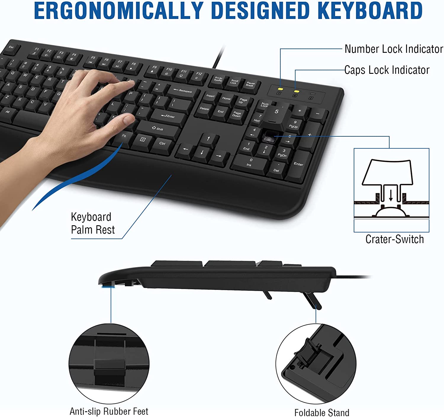 - 【104 KEYS LAYOUT AND ERGONOMIC DESIGN】EDJO full-sized wired keyboard is ergonomically designed with palm rest and foldable stand that can make it typing more comfortable. Anti-slip design on the bottom of the keyboard can prevent the keyboard from moving while typing, which is more stable to use.