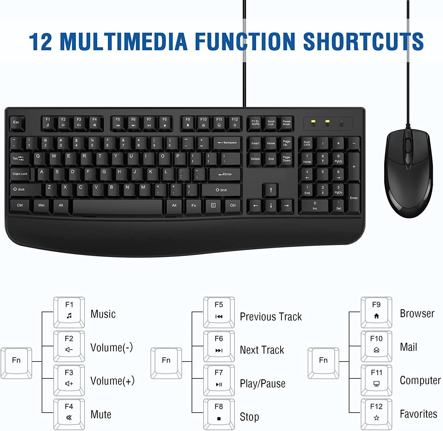 - 【12 MULTIMEDIA SHORTCUTS】The wired keyboard has 12 multimedia shortcuts combinations that is convenient to instant access music, volume, computer, mail, etc. it can improve work efficiency greatly. There are caps lock Indicator and number lock Indicator In the upper right corner of the keyboard. (Note: Some multimedia function are not available with Mac OS)