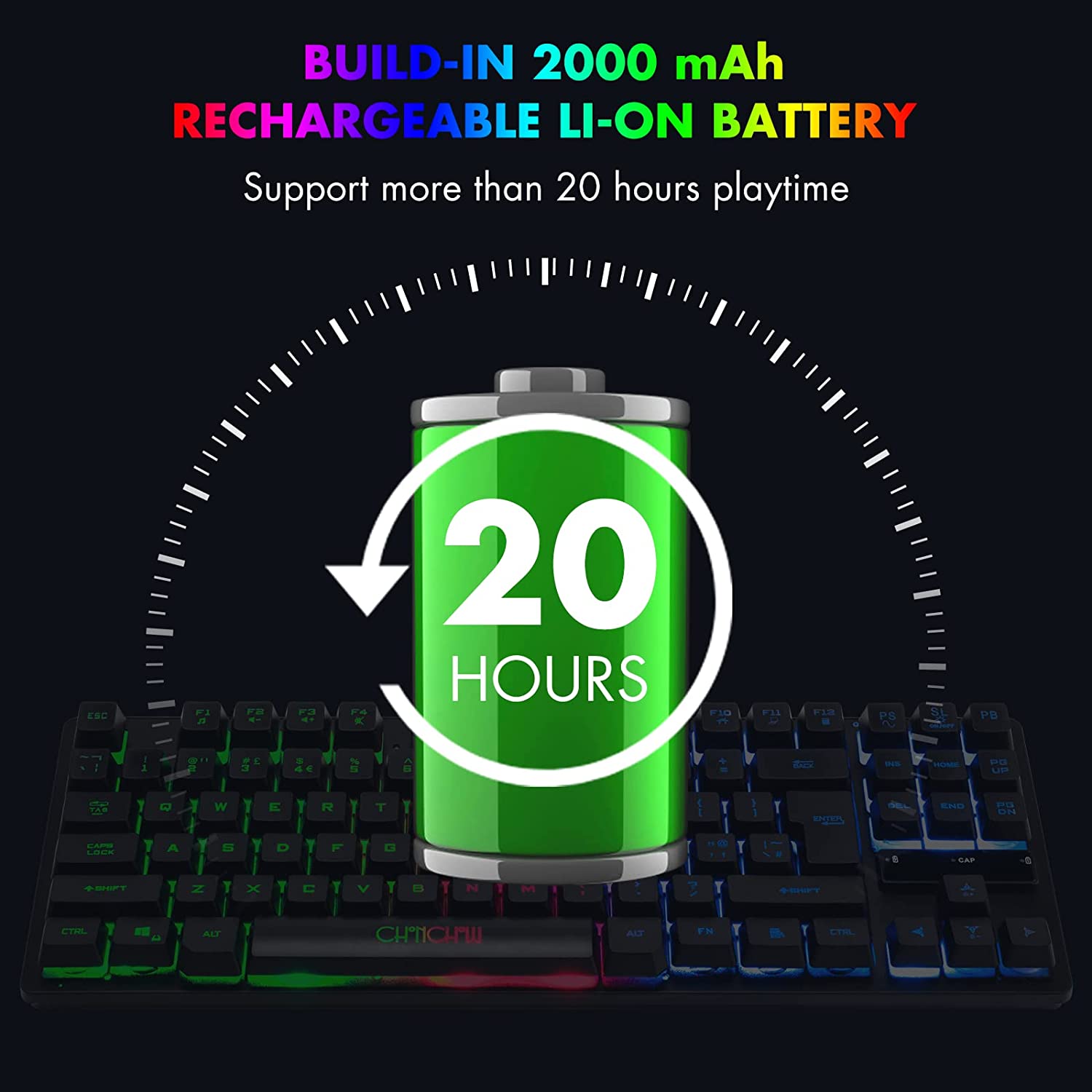 ★Rechargeable Tenkeyless Keyboard --- 2000mAh rechargeable battery with auto-sleep function and power switch,this keyboard will reduce the frequently you change the battery or charge effectly.87 keys layout can help people free up the space on table and offer more to mouse moving.