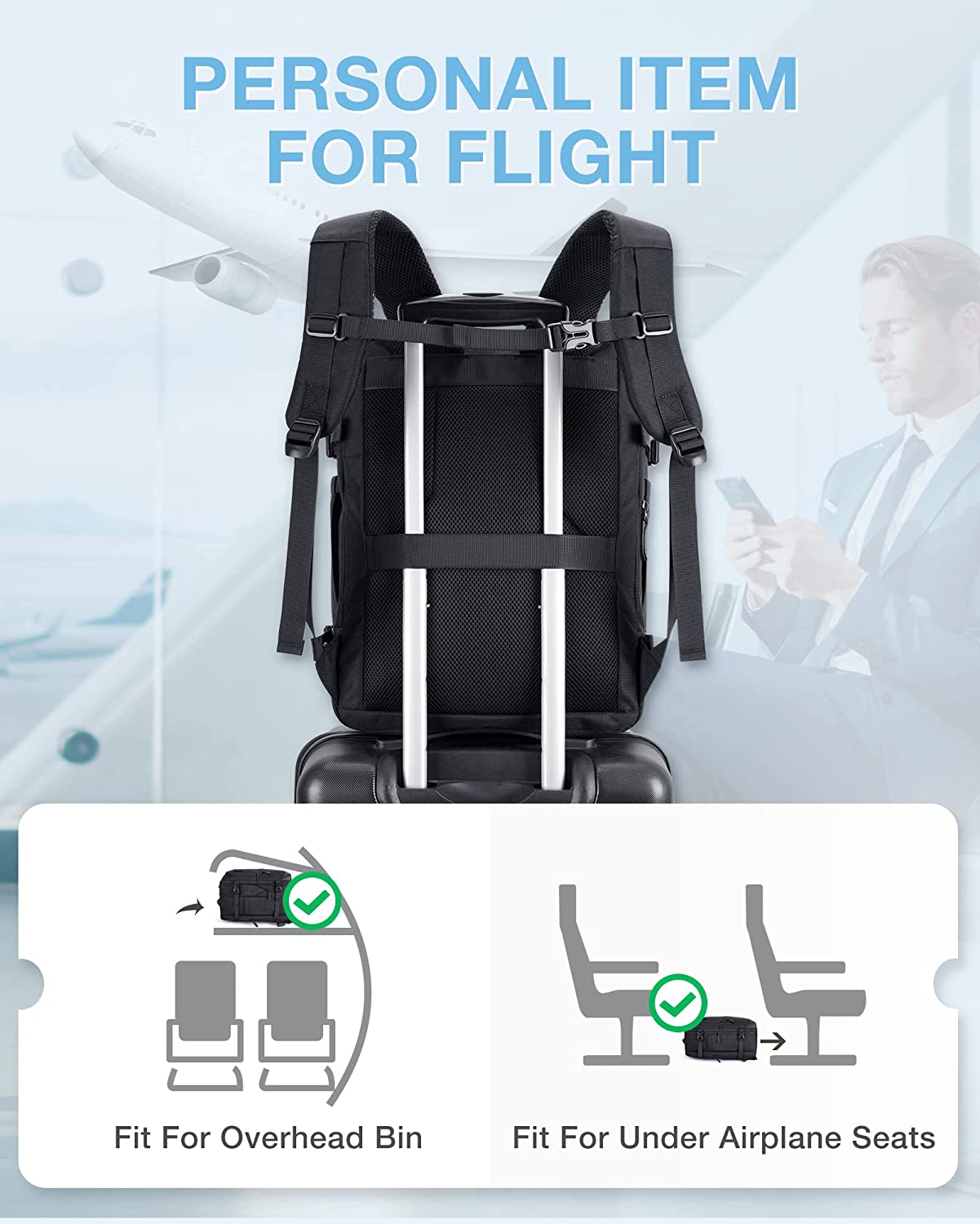 AIRLINE APPROVED: Travel backpack size: 20.47*13.38*7.87 inches. Maximum capacity: 40L, carry-on backpack meets the size required by almost all major airlines and fits in the overhead compartment and under the seat. Of course the lie-flat opening design helps you get through security quickly. This travel backpack is perfect for weekend trips, business trips, hiking, camping, etc.