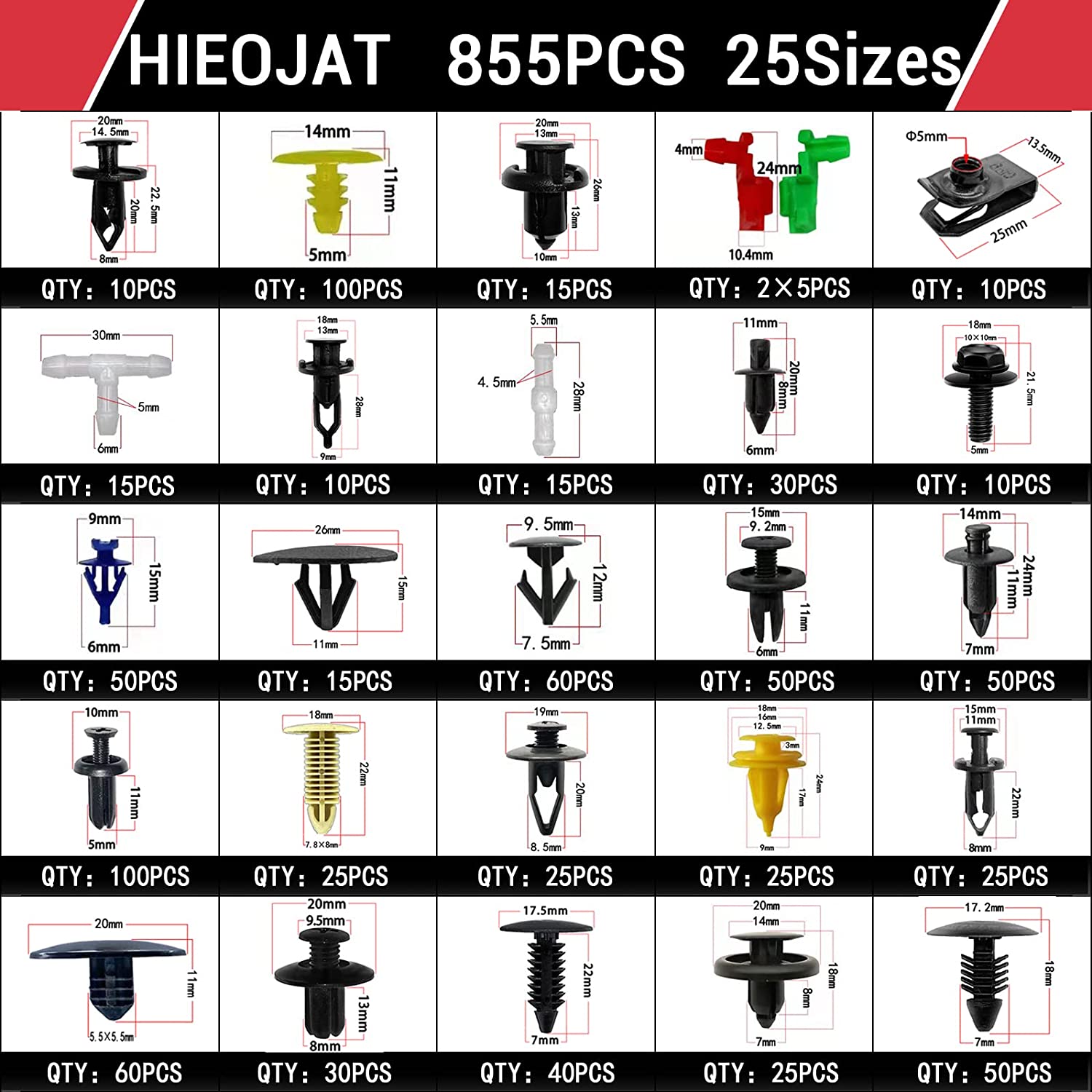 【910pcs car retainer push clips kit】 -Quantity: 910pcs/pack. Multi kinds of common size Suitable for for the trim panel clips, door trim clips, door panel clips,bumper clips,Fender clips,engine cover and splash shield retainers replacement.