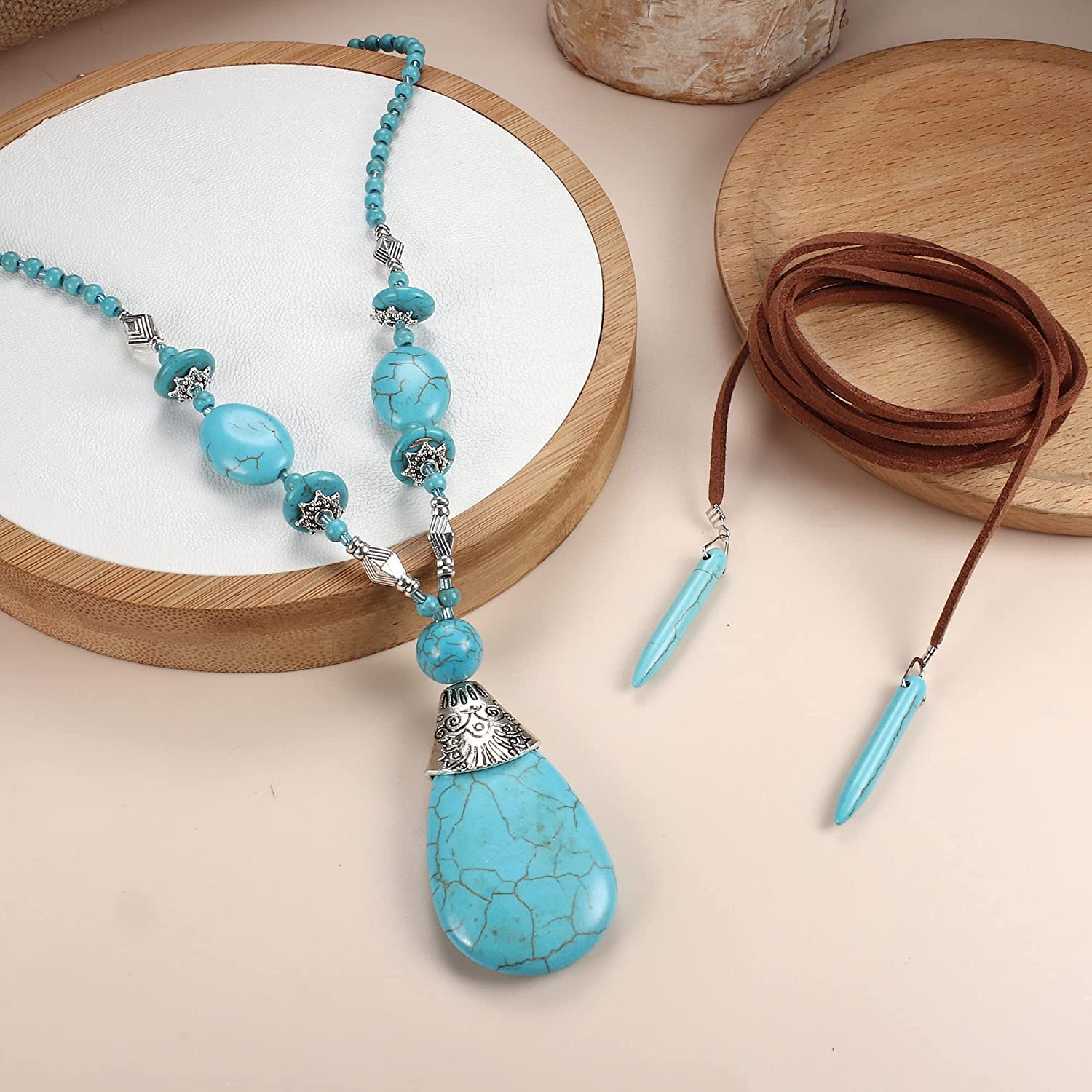 【TURQUOISE JEWELRY SET】Turquoise jewelry set includes 1 piece turquoise pendant necklace and 1 piece boho choker necklace, 1 piece layered turquoise bracelet and 2 piece adjustable turquoise bead bracelet,4 pairs of turquoise earrings and 8 pieces turquoise knuckle rings. Retro and fashion are perfectly combined to create a charming appearance for you.