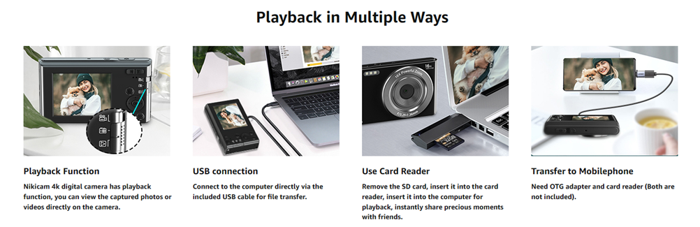 • 【Point and Shoot Camera with Webcam Function】NIKICAM vlogging camera for youtube can be used as a computer camera. Turn off the camera first, connect the camera to the computer with a USB cable, choosing the "Camera mode", you can have a video calls with your friends and family or livestreaming on tiktok youtube. The external 1/4 standard size tripod interface can be installed with a tripod to help you stabilize shooting or recording on your vlog.