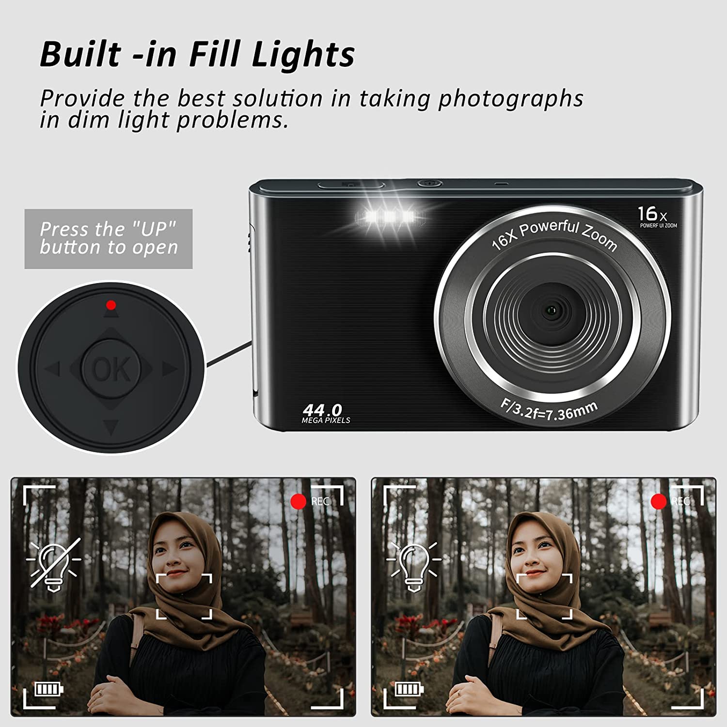 • 【4K & 44MP Digital Camera for Photography】NIKICAM 4k compact photography camera for kids girls boys adults has 4k video resolution and 44MP image resolution, and support 16X digital zoom, helping you capture and record the most exciting memorable moments with high-quality images or videos. This rechargeable digital camera come with a 32GB SD card, just turn the camera on and record the exciting moments wiht your family now!