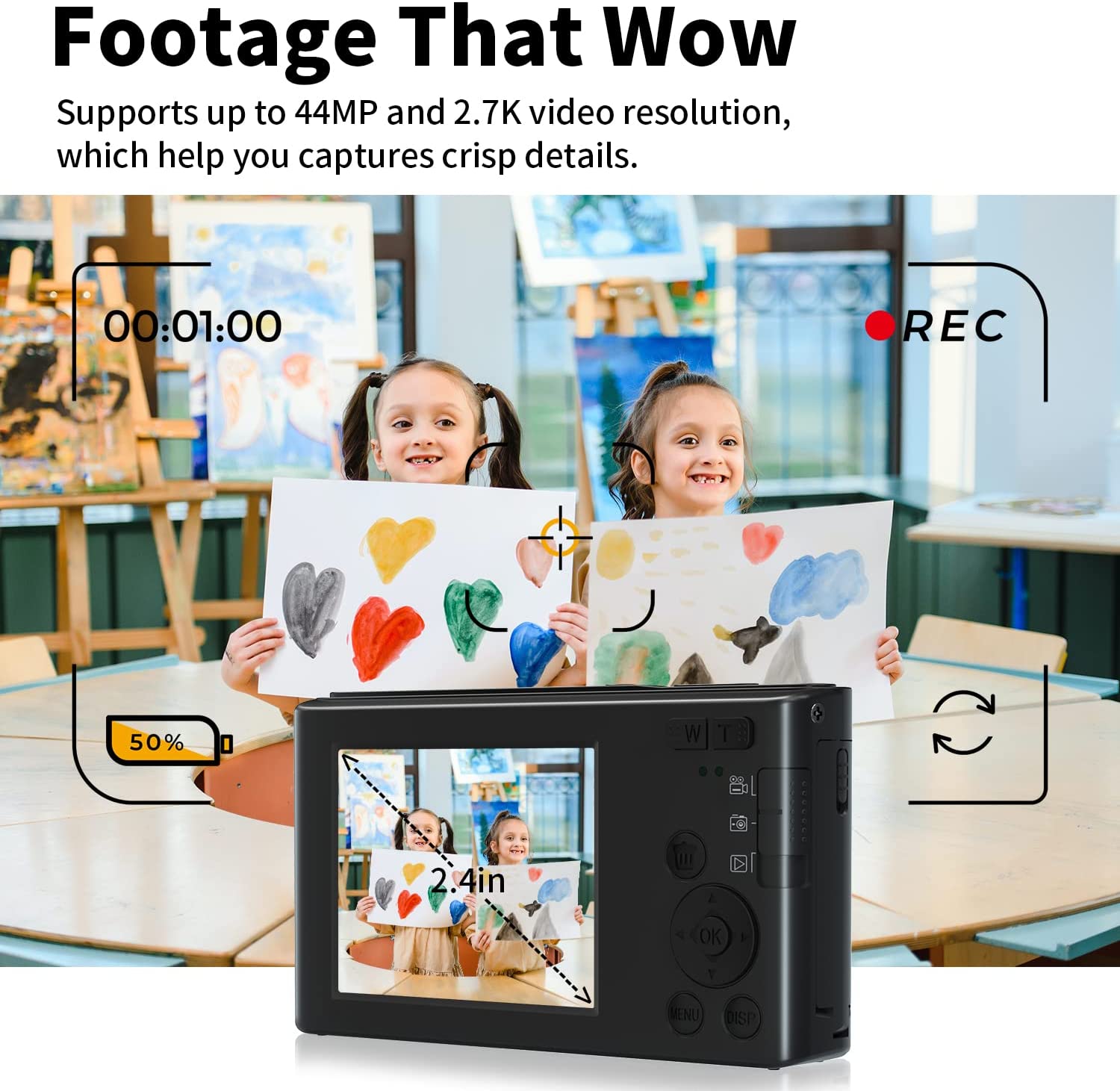 • 【16X Digital Zoom & 2.4" IPS Screen Vlogging Camera】NIKICAM kids camera supports 16x digital zoom, You can zoom in or zoom out the subject by pressing the W/T button while recording video and taking still images. The youtube camera for kids girls boys adults also has a pause function, you can press the "OK button" to pause when recording or playing a video. Designed with 2.4"IPS screen, which can present more natural and colorful images, and it's also a good protection for kids' eyes.
