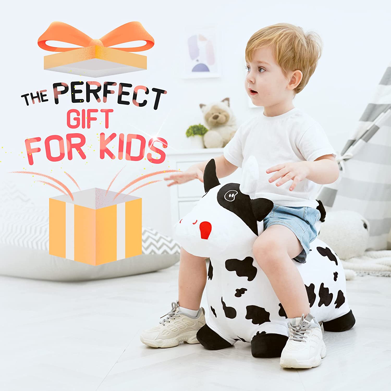 - AN INTERESTING & GREAT GIFT: Our cute bouncy house are popular among kids and make a great gift for any occasion. Kids can ride on cow like knights to fight bad guys (this is just role play), and the cute bouncy hopper will be a good friend to your child, accompanying them from day to night and bringing them fun. Our pretty hopper comes in exquisite packaging, making it a perfect gift for kids.