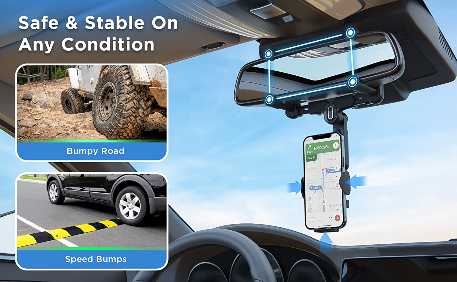 【Free Adjustment Angle】Rear View Mirror clamp designed with a 180° Half Spherical Swivel and Phone Holder with a 360° Adjustment Rod. Support most of your phones either vertically or horizontally over even the roughest terrain. Do Not Like the old style vent-mounted phone holder only be used on a traditional style horizontal air vent and can't be used on vertical or round vents.