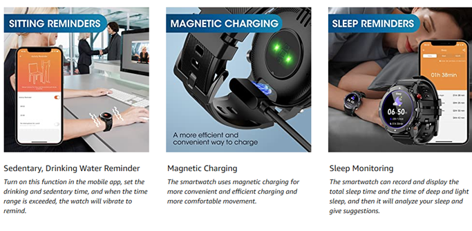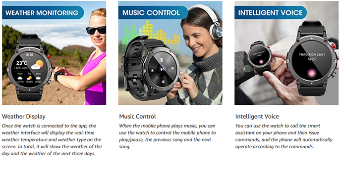 - ⌚【ALL-ROUND MANAGEMENT】- The smart watch can provide saturation measurement, sleep monitoring, as well as other functions to achieve total management from your wrist. All data can be synchronized to your phone for analysis and to help you create a scheduled routine to meet your goals.
