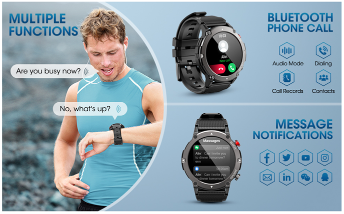 - ⌚【BLUETOOTH DIALING & BUILT IN SPEAKER】- With Bluetooth 5.0, you can directly dial the phone number and answer calls on your watch. You can get notifications of calls, SMS and SNS messages, Whatsapp, text, Facebook, etc. You will never miss any calls & messages during meetings or workouts.