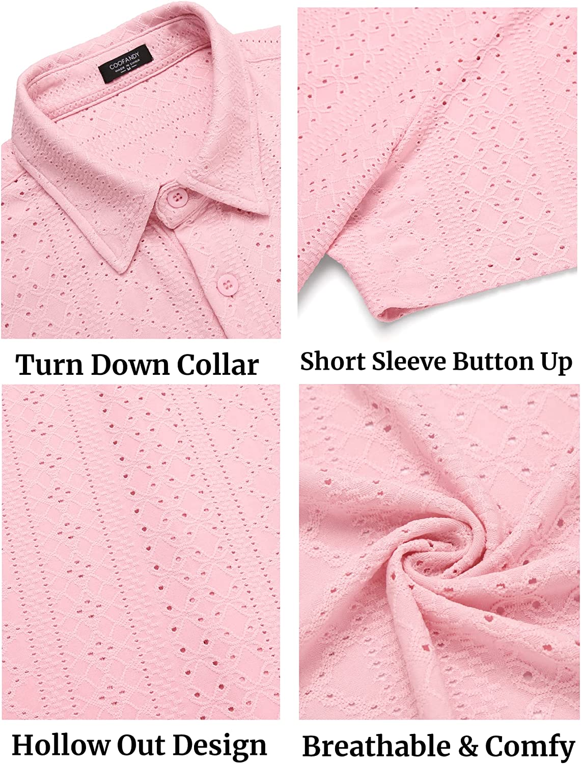 - STYLISH DESIGN - Men's Beach Shirts featuring Short Sleeve, Button Down Closure, Turn Down Collar, Solid Color, Hollow Out Geometric Design, Pattern Eyelet Embroidery. This men's summer shirts will become a unique highlight for your daily wear & vacation wear. It is a must-have shirts for men's wardrobe.