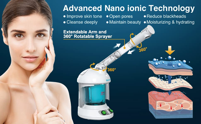 - 【Cleanse Deeply and Blackhead Removal】: Are you still worried about 'strawberry nose'? This facial steamer is the best choice for skin care tools! Open your pores by using the warm moisture of this steamer to remove dirt, oil, dead skin, blackheads and impurities thoroughly. Make your skin fresher, smoother and more radiant for using facial cleanser, toner or scrub more effectively after steaming.