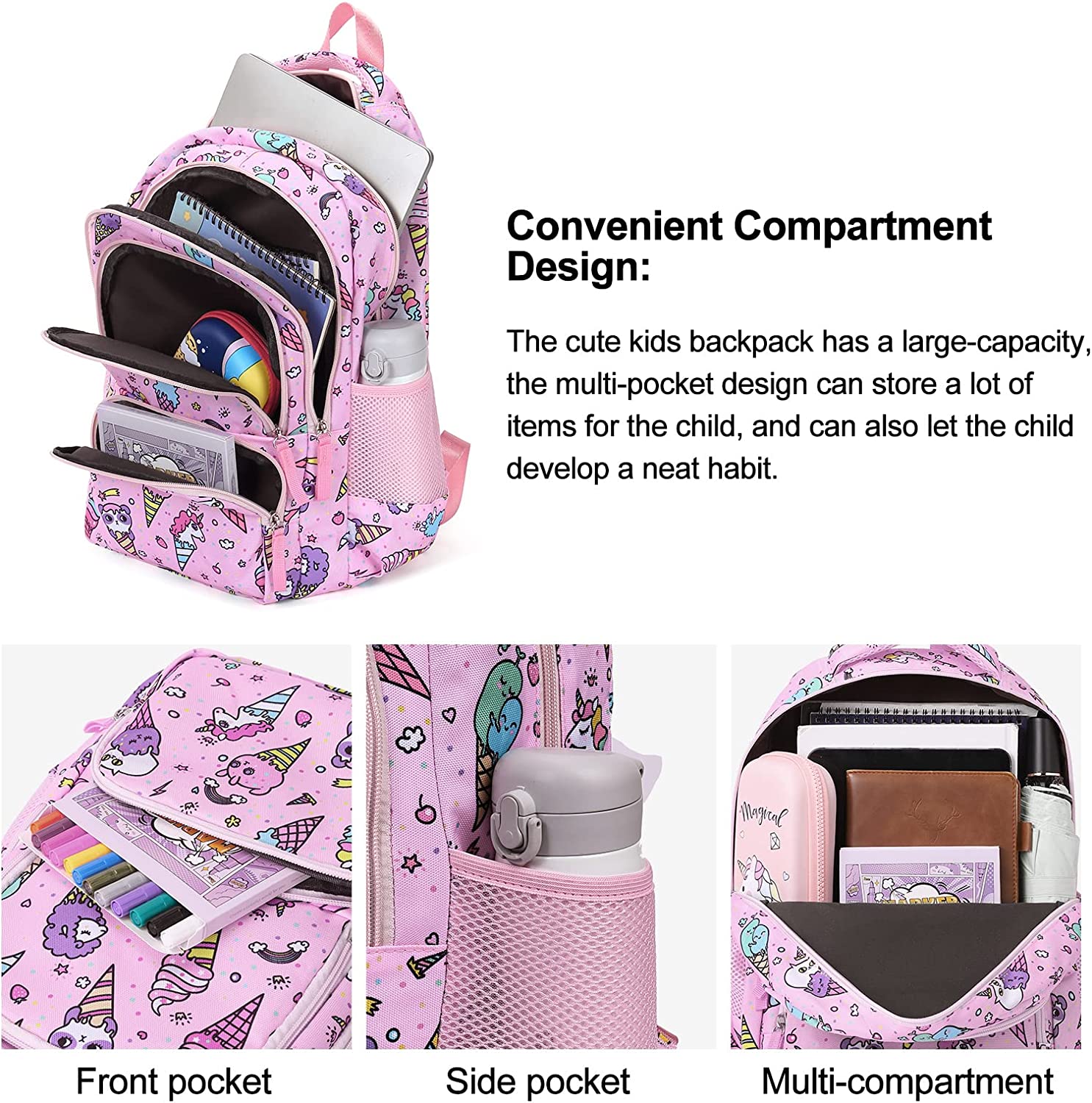 CONVENIENT&LARGE CAPACITY: 15.75 * 12 * 5.12 Inch, the size of girls backpack for elementary is suitable for primary children(6-12 years old are best), the multi-pocket compartment design can hold many items makes the capacity more possible, child can put books, pen cases, lunch boxes, ipad, coats into the elementary school backpack, side pockets can hold umbrellas and water bottles, the large kid backpack for girls allows kids to no longer worry about forgetting things and makes things neat.