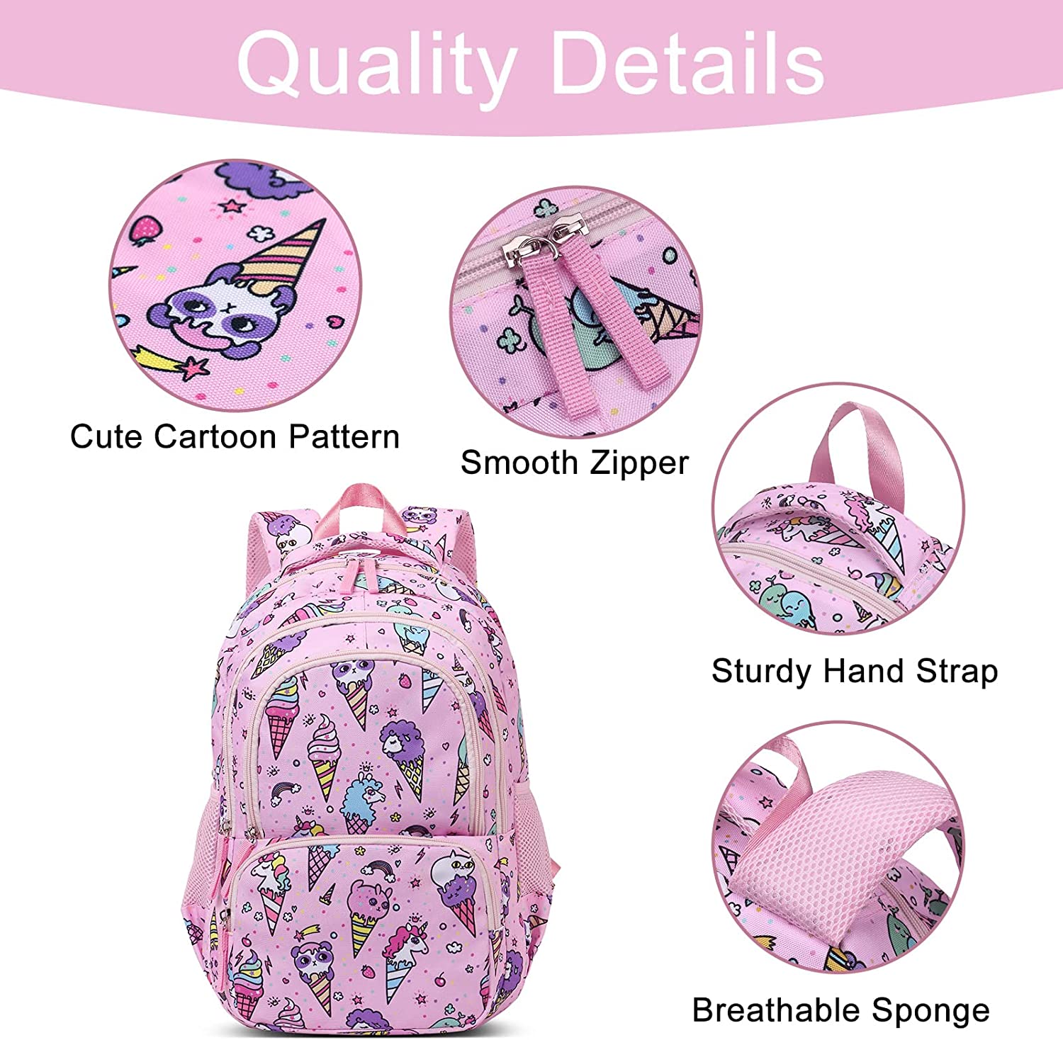 SOFT&STURDY MATERIAL: The outer material of the kids backpack for school is made of soft and tough 600D nylon fabric, which is high-quality and durable, the back of the girls backpack adds a soft sponge layer to prevent the child's back from being affected by hard objects, the preschool backpack adopts a wide adjustable shoulder strap lined with a sponge design to relax shoulder and reduce pressure.