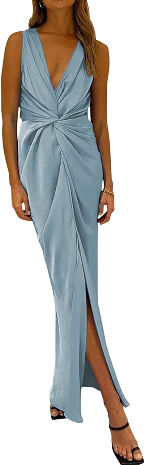 STYLISH DESIGN: Ruched Bodycon Dress For Women/Deep V Neck Satin Dress For Women/Sleeveless Maxi Dress For Women/Twist Front Dress For Women/Split Dress For Women/Solid Color Tank Dress For Women/Evening Party Dress For Women/Wedding Guest Dress For Women/Cocktail Dress For Women/Summer Dress For Women Trendy