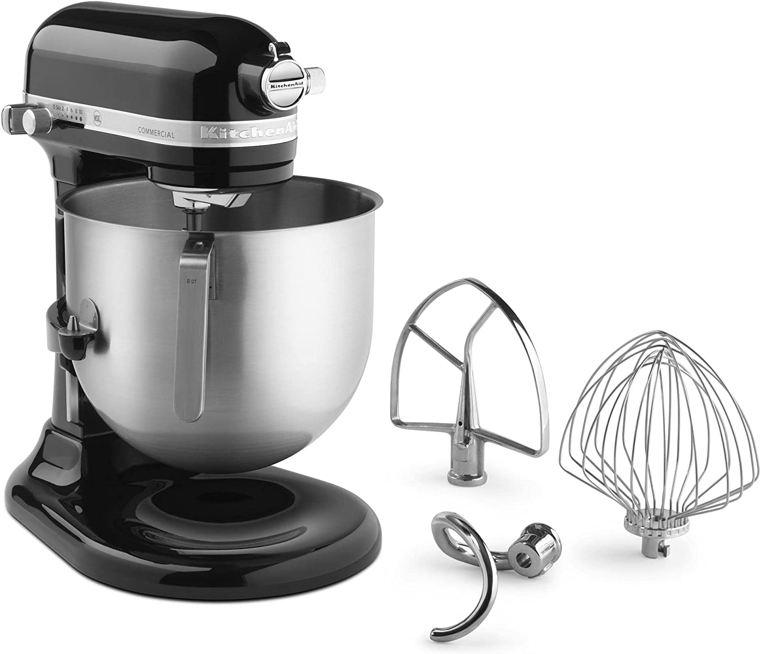 Metal construction, Black in color. Power hub is compatible with all Kitchenaid attachments. Robust metal control knobs. Professional bowl-lift design. Speed control protection. NSF listed. 13-3/8"Wx14-5/8"Dx16-1/2"H. 120V. 1.3 HP. 10 speeds.