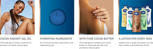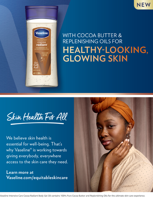 Vaseline Intensive Care Cocoa Radiant® Body Oil, with 100% Pure Cocoa Butter and Replenishing Oils, for the ultimate skin care experience. This body oil moisturizes dry and dull-looking skin for visibly healthy-looking, glowing skin. Our vitalizing skin moisturizer formula, infused with 100% Pure Cocoa Butter and Replenishing Oils, locks in moisture to promote a smooth, natural glow. With a soft, cocoa fragrance, this body oil is the ideal moisturizer for relieving everyday dryness, as well as soothing irritation. Smooth, hydrated skin can be yours with Vaseline Intensive Care Cocoa Radiant Body Oil. Vaseline’s moisturizing lotion goes beyond basic moisturization. Our Intensive Care range works to heal dry skin from deep within. The formula used in this body moisturizer for dry skin restores the essential moisture your skin needs, while also delivering a blend of nourishing ingredients. Vaseline assists the skin’s natural recovery to help dry skin heal by locking in moisture. Explore the range of Vaseline products, including Vaseline lotion, and enjoy the healing power of Vaseline. Skin health is essential for well-being. We’re helping those underserved get better care for their skin.
