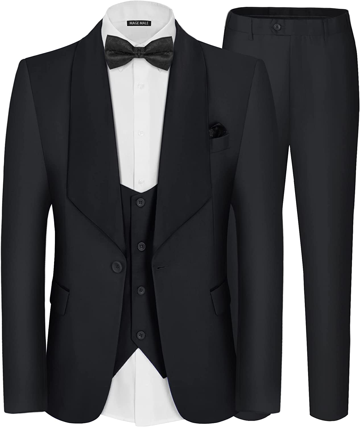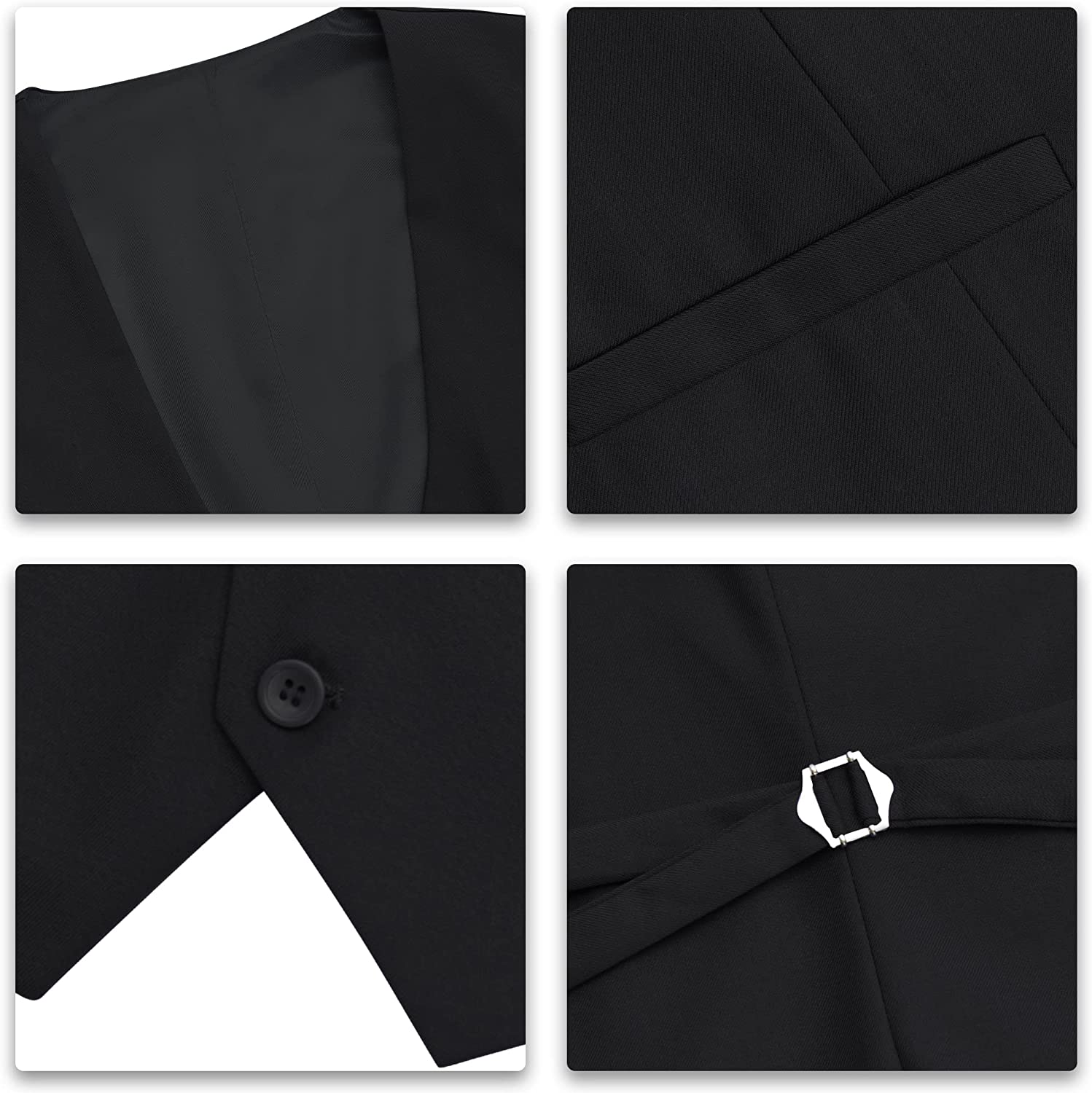 FEATURE:Blazer: One Button Closure,Single Breasted,Shawl Collar,Side Vents,Slim Fit Style;Vests:Four Button,U-Neck, Back Have Adjustable Back Tie;Pants:Flat Front,Zippered Fly,Button End and Adjustable Waist Tab.
