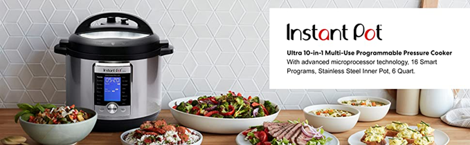 Instant Pot Ultra 10 In 1 Multi-Use Programmable Cooker is the next generation in kitchen appliances. Designed for the home chef looking for a greater degree of customization and control for even greater precision cooking. The Ultra combines the functions of a Pressure Cooker, Slow Cooker, Rice/Porridge Cooker, Cake Maker, Yogurt Maker, Saute/Searing, Steamer, Warmer, Sterilizer, and, a truly new and unique feature, the ultra-program. The 'Ultra' provides complete custom programming for pressure and non-pressure cooking. Now, one can set the exact parameters desired to achieve perfect results each and every time. With the 'Altitude' adjustment, the guesswork is eliminated from a recipe conversion providing a more precise cooking time. Designed with a large, blue LCD display with a 'Cooking Indicator' to provide one a clear visual on the progress of your dish from preheating, cooking, and Keep Warm. A central dial with a simple turn and press provides added precision in program selection and adjustments. And, the new - 'Steam Release Reset Button' ensures the safer handling of the steam release after cooking is completed. Built with 16 smart programs: Soup/Broth, Meat/Stew, Bean/Chili, Cake, Egg, Slow Cook, Saute/Searing, Rice, Multigrain, Porridge, Steam, Sterilize, Yogurt, Warm, Pressure Cook, and Ultra. Now, your favorite dishes are as simple as selecting your preferences and having them ready up to 70% faster. With the 'Sterilize' program one can pasteurize dairy products, sterilize baby bottles, jars, and utensils; As well as, perform certain types of canning much more conveniently than ever before The 'Cake Maker' is designed to prepare soft and moist cakes and the 'Egg' prepares perfect eggs in just a few minutes. America's most trusted brand has moved into a category of its own with the Instant Pot Ultra Delay Start time - Up to 24 hours.How It Works:The microprocessor carefully runs lab-tested algorithms to control the time, cooking pressure and temperature to ensure consistent cooking results. Users can customize these settings to control pressure level, adjust cooking time and a cancel button, allowing one to achieve their preferred cooking results. For instance, the “meat/stew” key is programmed to prepare perfectly tender, thoroughly heated meat dishes; however, users can attain fall-off-the-bone results by adjusting the cooking time.The fully sealed environment traps the flavors, nutrients, and aromas of the food instead of releasing them throughout the home. During pressure-cooking, heat is distributed evenly, deeply and quickly once pressure is built. In addition, minimal water is required for steaming so vitamins and minerals are not leached or dissolved. As a result, greens retain their bright colors and phytonutrients, meats and bones are thoroughly cooked yet tender, and whole grains and beans are soft and delicious, all with remarkable consistency.Designed to cater to varying tastes and food conditions, Ultra has adjustable settings to achieve one’s desired cooking results; 3 temperatures in ‘Sauté’ for searing, simmering or thickening for a maximum time of 30 minutes, and 3 temperatures in ‘Slow Cook’ to complete the tasks of a common slow cooker, ‘Keep Warm’, and 3 temperatures in ‘Warm’ to preheat food.The 24-hour delay start allows users to postpone the cooking start to have dinner ready when you are. Automatic ‘Keep Warm’ holds the temperature of the meal until you are ready to serve. With the ultra, one can easily turn the ‘Keep Warm’ function on/off. Power supply: 120V – 60Hz.