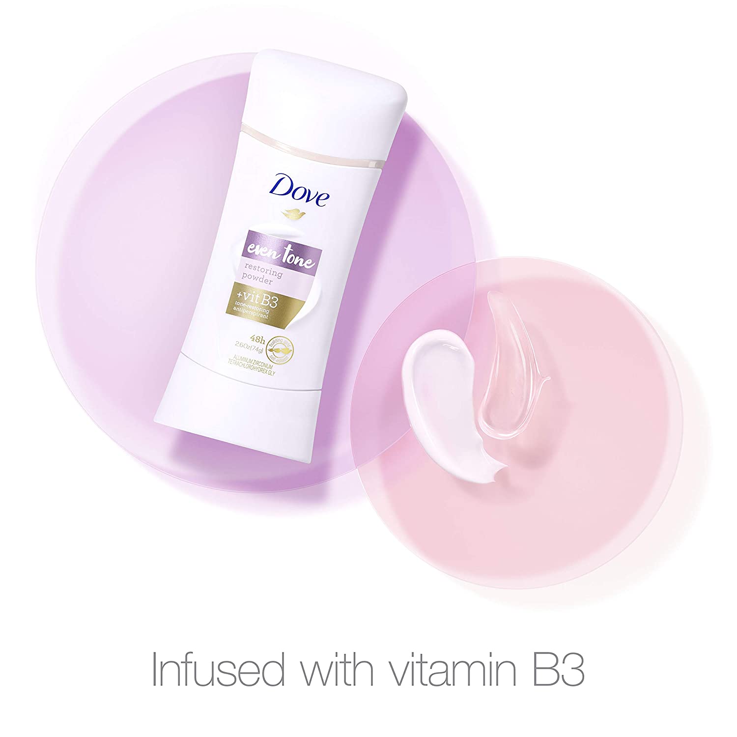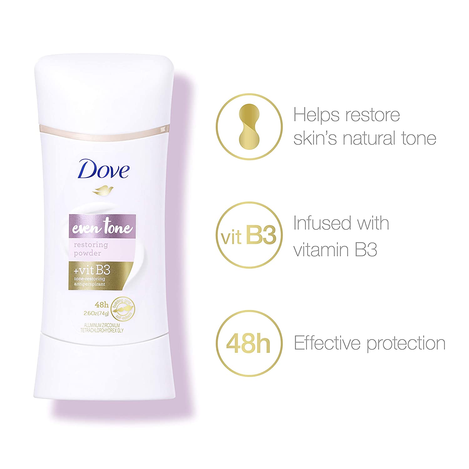 Give your underarms the care they deserve with Dove Even Tone Restoring Powder Antiperspirant Deodorant. Dove Even Tone is enriched with premium skincare ingredients, and it is specifically designed to help restore skin to its natural tone just within 3 weeks. Dove Even Tone Antiperspirant Deodorant features a unique formula, that moisturizes the skin and helps improve uneven tone. The formula of this tone-restoring stick antiperspirant is infused with Vitamin B3, and it is also enriched with our unique ¼ moisturizers, which help your delicate underarm skin recover from irritation. Dove Even Tone belongs to the only 48-hour antiperspirant range that helps restore skin to its natural tone, and it is cruelty-free certified by PETA. It’s pleasantly scented with a modern powder scent and a sophisticated floral that will leave you feeling fresh and smelling great all day. Dove Even Tone women’s antiperspirant deodorant is our best care for soft and even toned underarms, and it leaves you confident to reveal underarms without a second thought. Now there’s nothing standing between you and confidence that lasts all day. For the best results and a long-lasting fragrance, use on clean, dry underarms. Twist the applicator to release the smooth antiperspirant deodorant stick and glide on in even, light strokes.