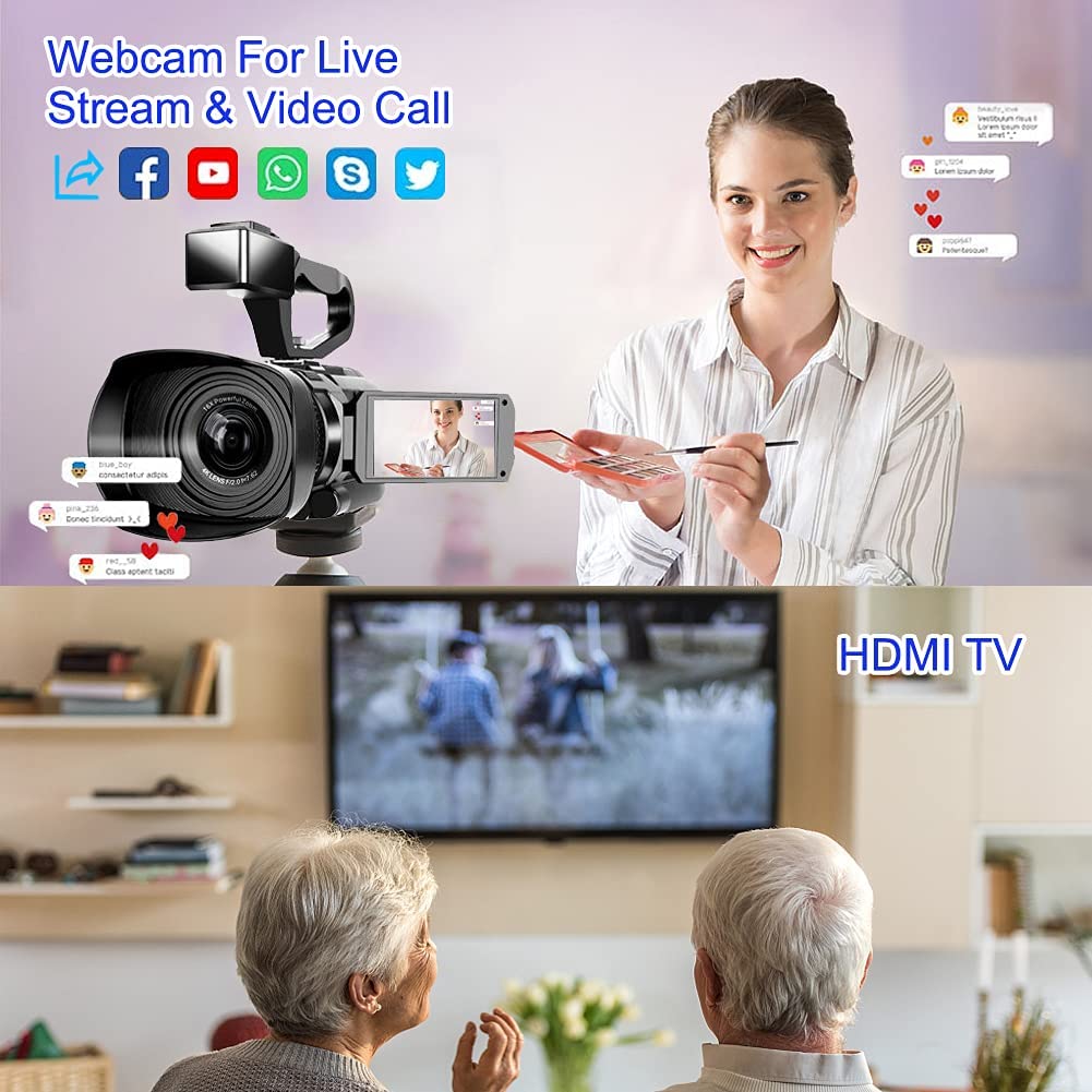 - HDMI Output & Webcam: This 4K camera camcorder supports webcam function(support windows7/8/10 system and MAC system). Use a USB cable to connect to a computer and select PC mode for live broadcast or video chat.If you want to play video on the TV, you can plug it into the TV with the HDMI cable (included), which is very convenient.