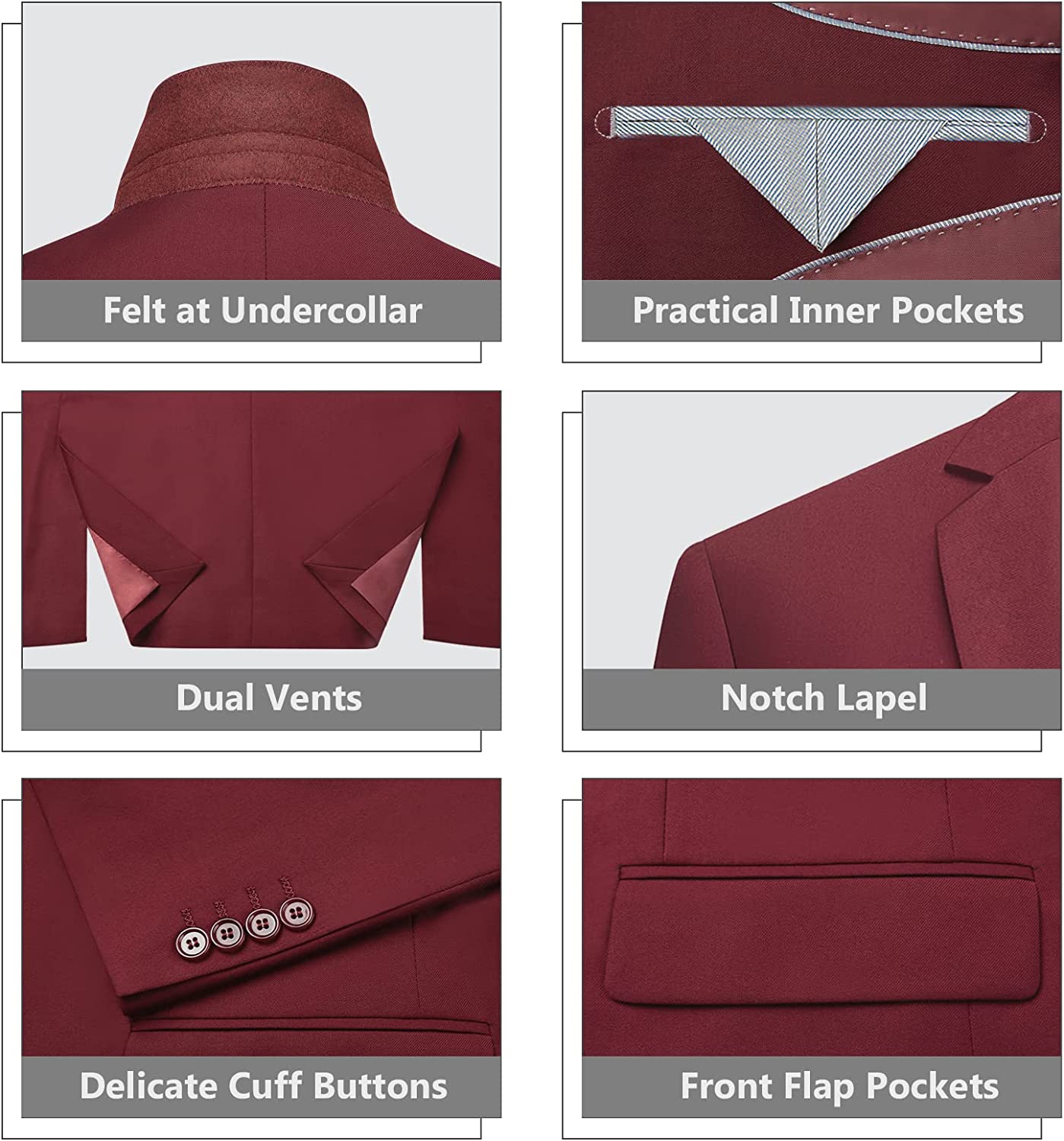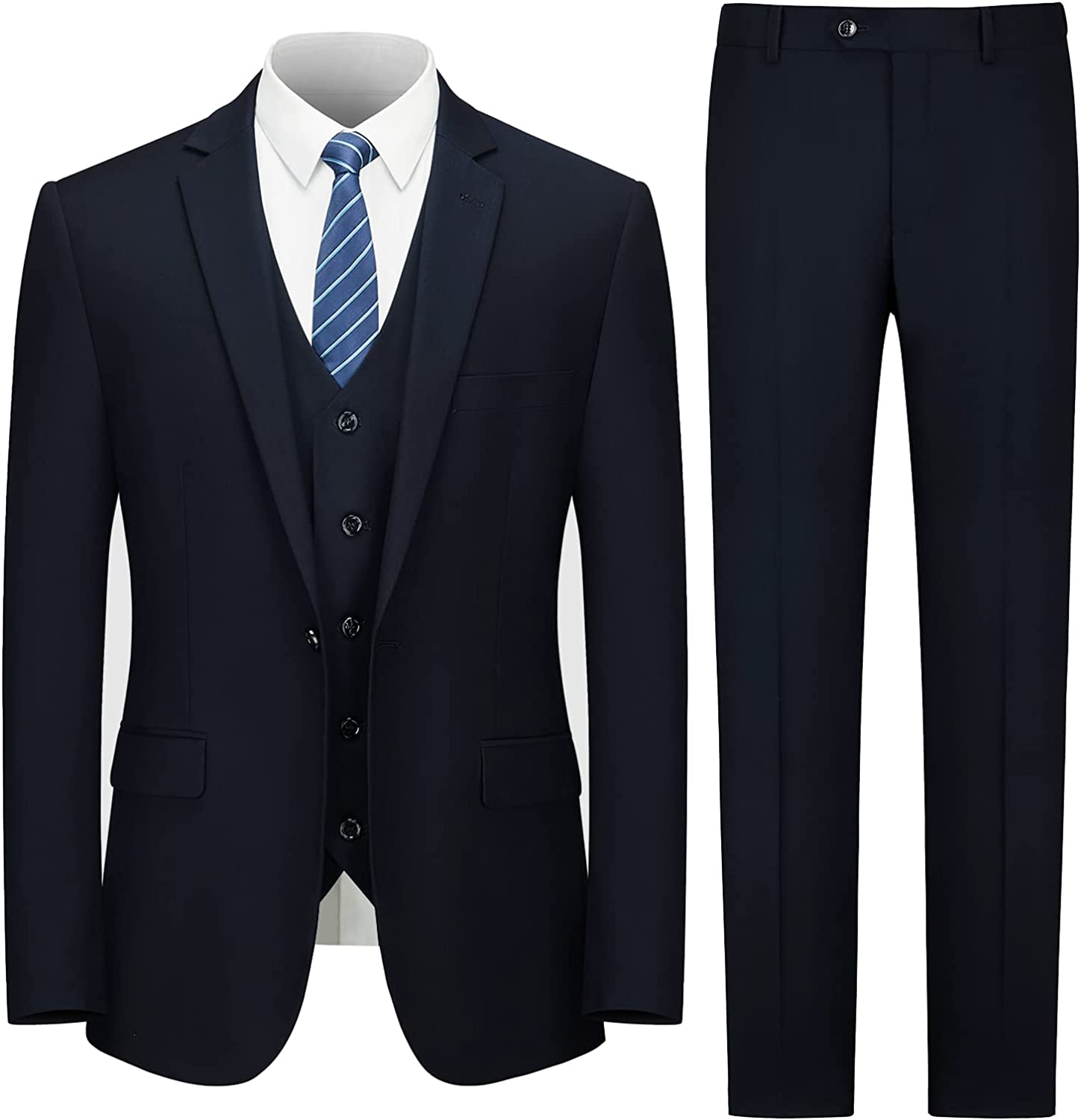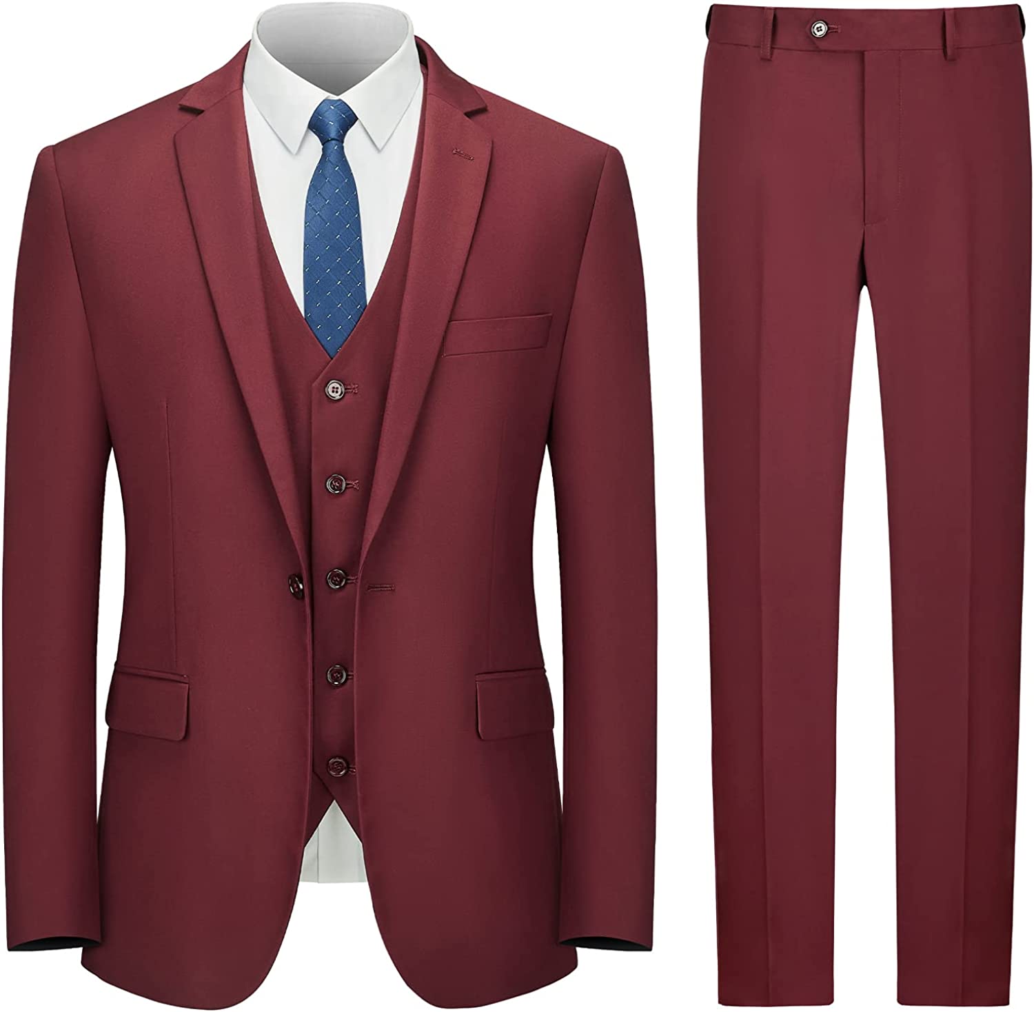 • 【MENS SUITS FEATURES】 Our slim fit suits for men are designed with a modern style and cut using 3D draping techniques. Jacket: Single breasted one button closure/ Notch lapel/ 3 Practical inner pockets/ 4 Sleeve buttons each side/ 2 Front flap pockets/ 1 Real handkerchief pocket; Pants: Flat front/ Expandable waist/ Invisible zipper/ 2 Real back pockets; Vest: 5 buttons/ V-neck vest;