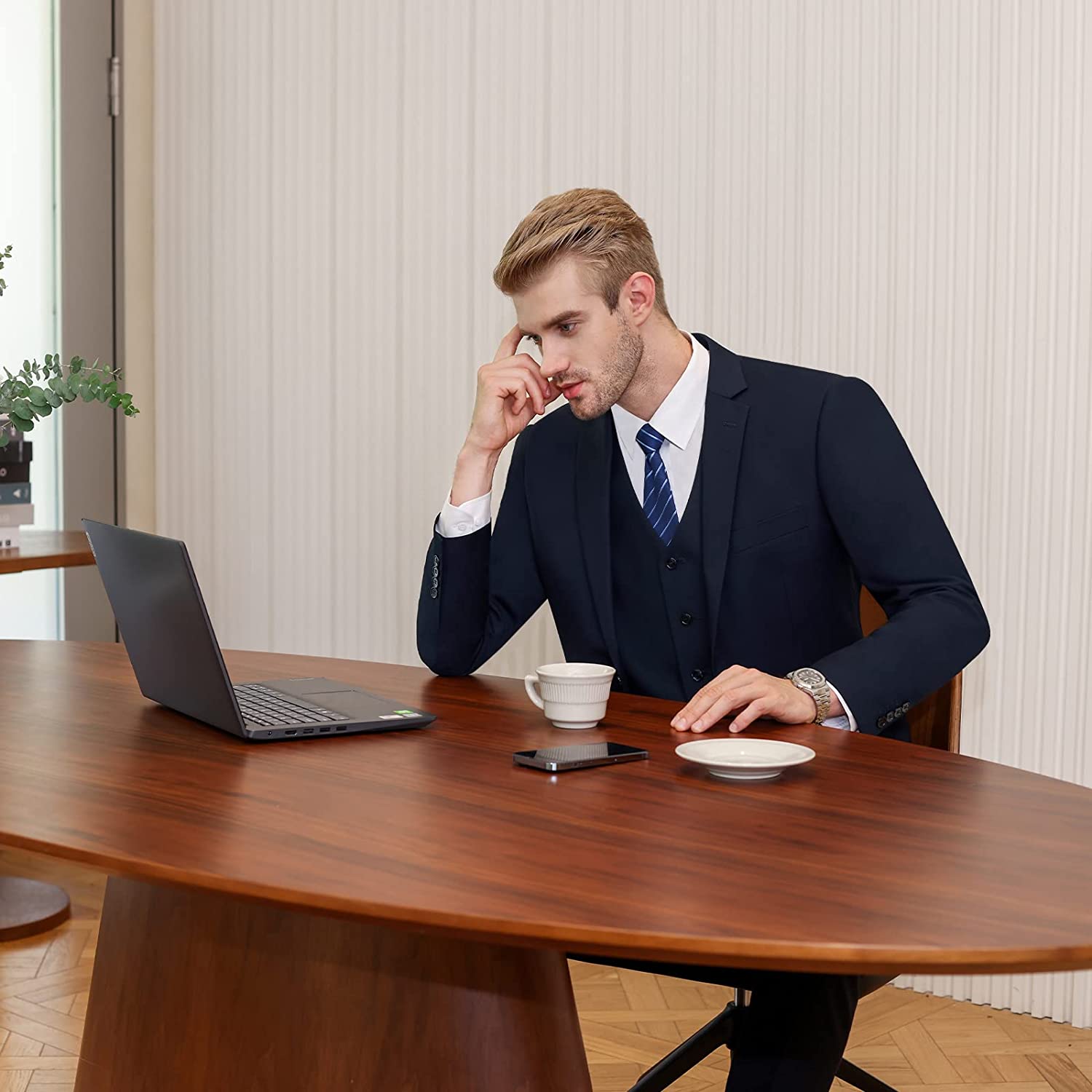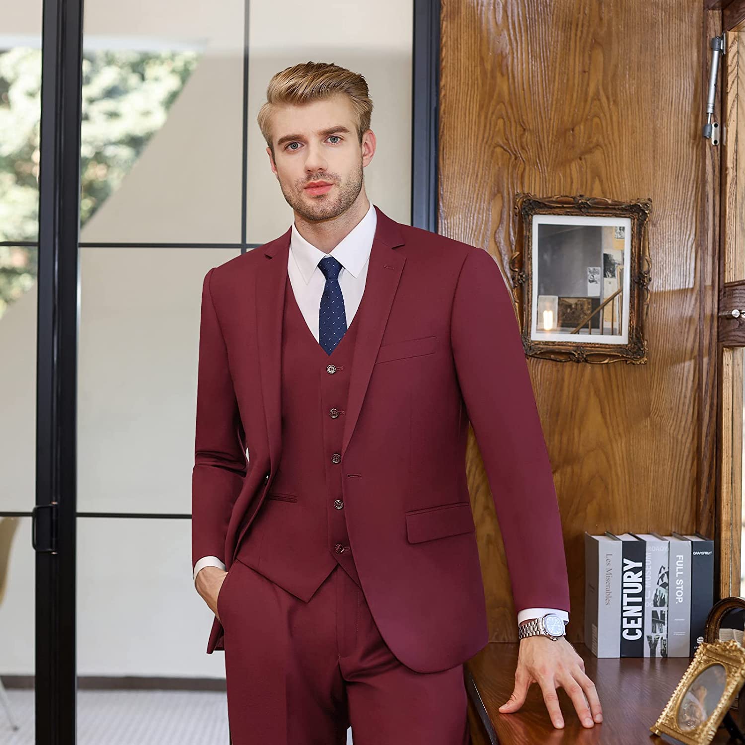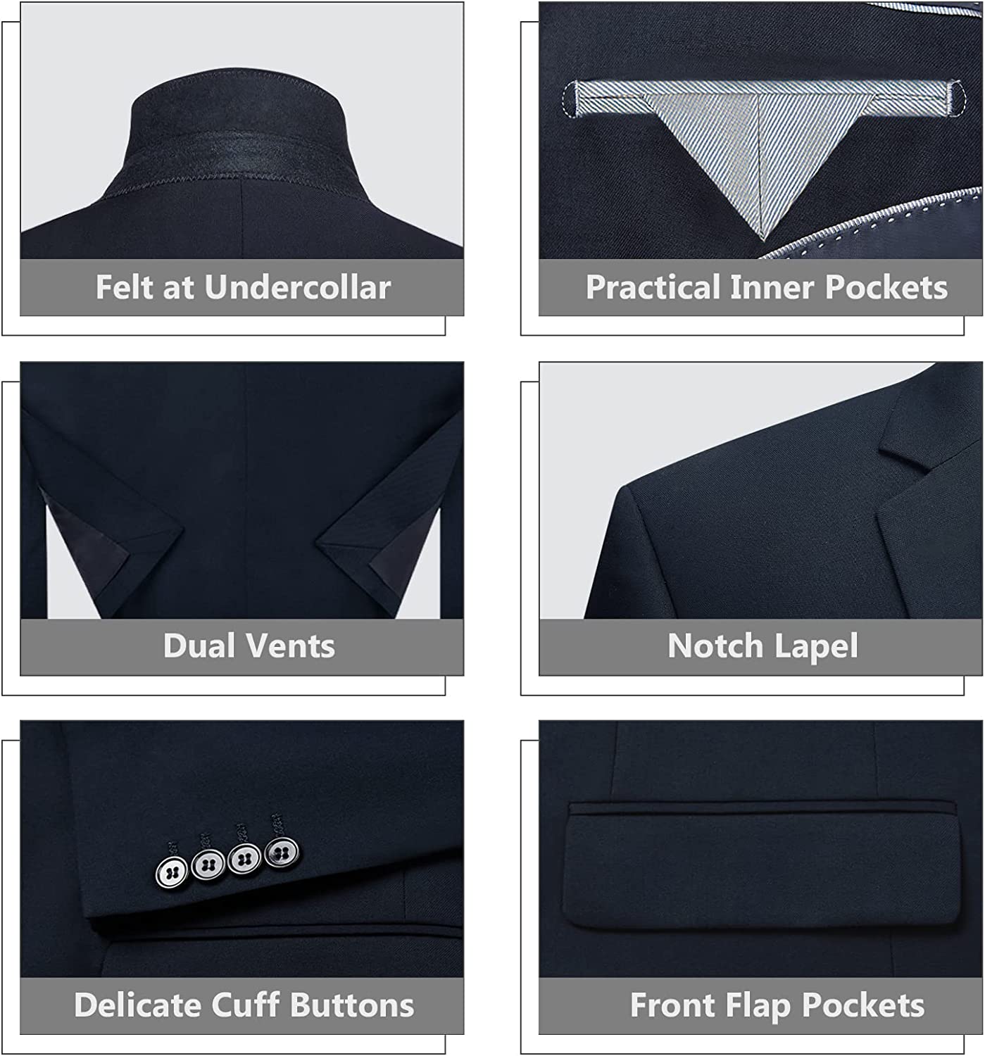 • 【MENS SUITS FEATURES】 Our slim fit suits for men are designed with a modern style and cut using 3D draping techniques. Jacket: Single breasted one button closure/ Notch lapel/ 3 Practical inner pockets/ 4 Sleeve buttons each side/ 2 Front flap pockets/ 1 Real handkerchief pocket; Pants: Flat front/ Expandable waist/ Invisible zipper/ 2 Real back pockets; Vest: 5 buttons/ V-neck vest;