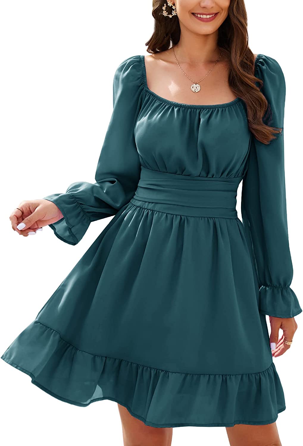 Features: Square neck, long lantern sleeves, ruffle elastic waist, back tie bow, mini length, slim fit, A-line swing dress, off shoulder if you like.