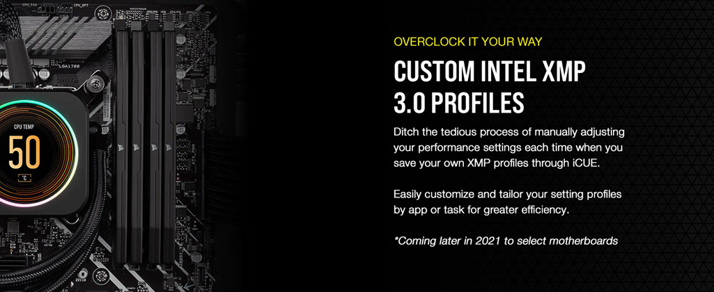 • Custom Intel XMP 3.0 Profiles: Customize and save your own XMP profiles via iCUE to tailor performance by app or task for greater efficiency.