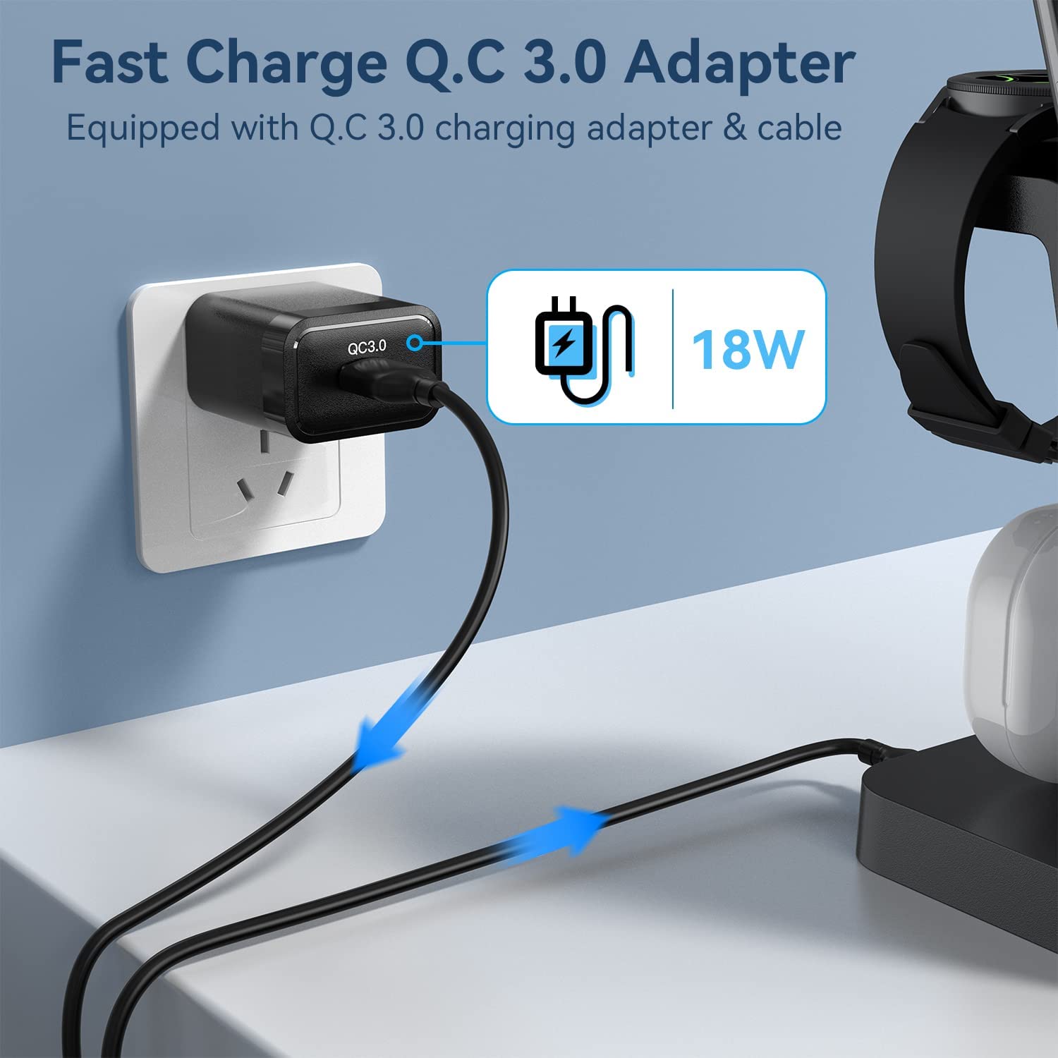 【Safety Fast Charging】Our 3 in 1 charging station for Samsung is equipped with FCC safety certified 18W adapter and type-c charging cable, enable fully charge your smart device in just 2 to 3 hours.The charging dock of charging station adopts intelligent protection technology, which provides temperature control and overcurrent protection to ensure safe and fast charging.