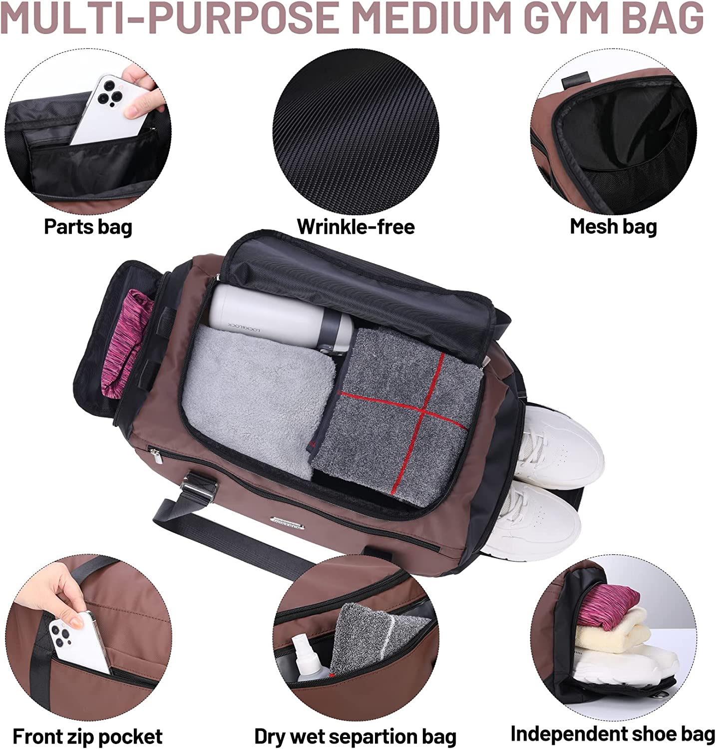 【LARGE CAPACITY Weekender Bag】Gym bag for men has 1 main bag, 1 wet pocket, 1 independent shoe compartment, 1 side zip pocket, 1 inner zip pocket, 1 back luggage sleeve. Large enough to store 3-7 days travel necessities.