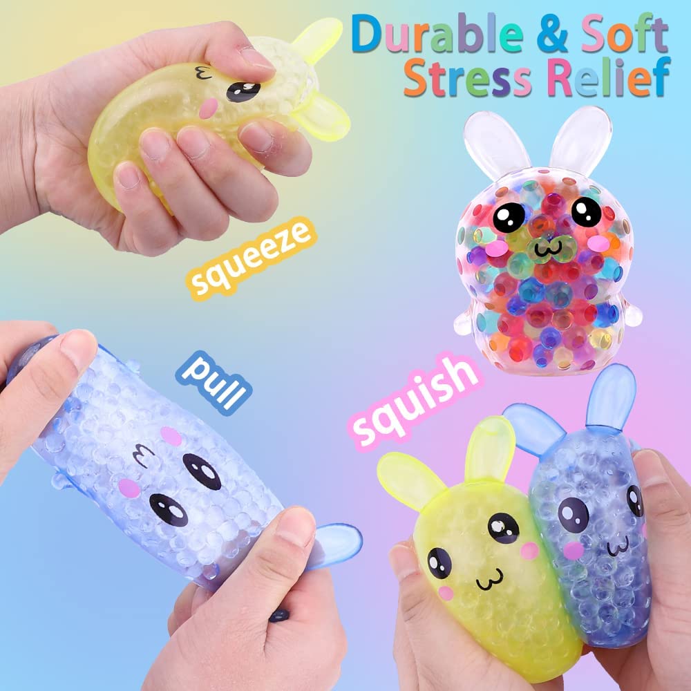 【Warm Tip】 Kids and adults will love the Easter bunny egg stress ball toys. Wash them with mild detergent or soap, and then dry them in a ventilated place for several hours to eliminate the slight rubber smell. Contains small colorful plastic water beads inside, so keep away from children 3 years old and under, keep away from pets to avoid accidental eating.