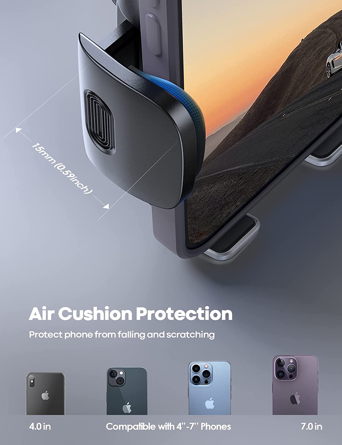 ?【Thick Case Friendly & Air Bag Protection】Upgraded 15mm wide clamp arm provide a wider grip, this phone mount for car vent clip is suitable for thicker cases, wallet cases or battery cases. Air bag layer on side of clamp provide phone scratch-resistant. Wide compatible with iPhone 14/ Pro/ Max, Iphone 13/ Pro/ Max, Iphone 12/ Pro/ Max/ Mini, Iphone 11, X, XR, SE, 7, 6, Galaxy A51 A51 A31, S21, S20, S10, Note 10 android and more 4-7”.